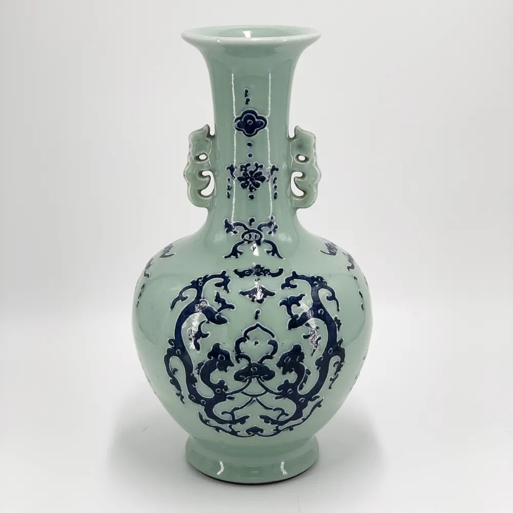 清乾隆豆青堆白青花夔凤纹双耳瓶
