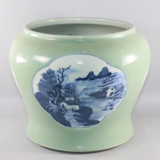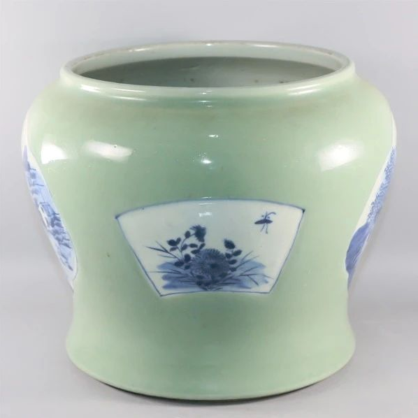 这件【清嘉庆豆青釉四面开光青花山水图尊】就是豆青釉青花瓷中数量稀少的大型陈设用精品。