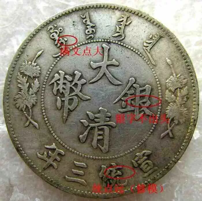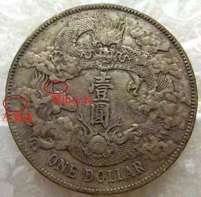 银字不出头,满文点大,统点远(修模所致),龙尾出云短,龙面内齿左宽齿暗记。