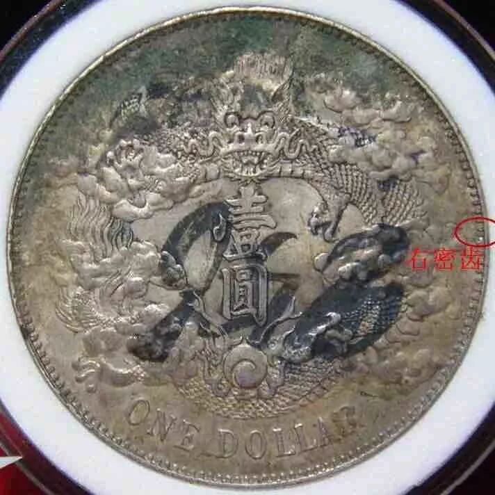 银字不出头,满文点大,统点远(修模所致,应该是统点近,有些币还留有明显的修模痕迹)龙面圆内齿,龙眼双眼皮,龙脚上有鳞,龙珠旁火焰内有鳞。龙尾出云短,深版直边齿。此版应为修模版,好品非常少见。