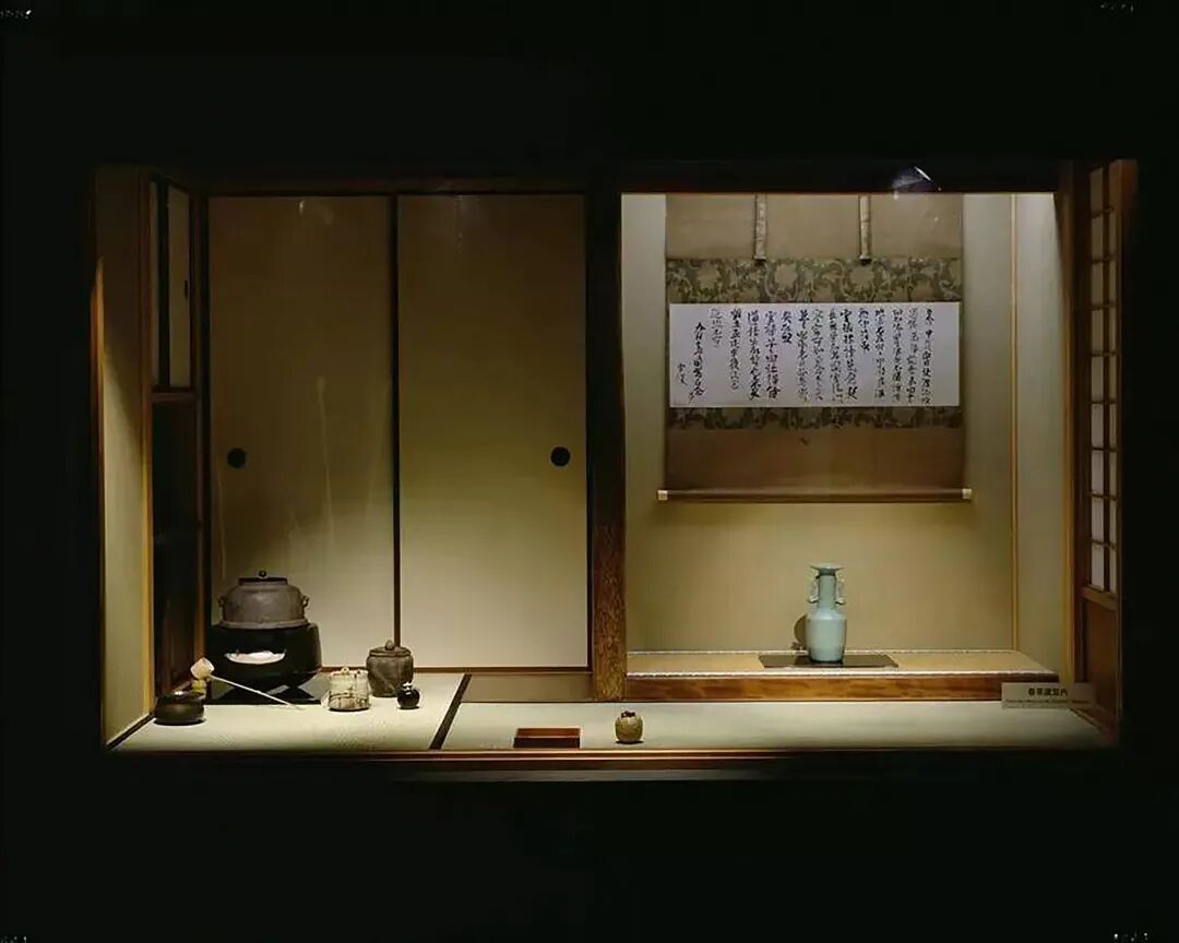 2017年日本东京国立博物馆“茶道的艺术:日本文化的精髓”展览上展出的茶室场景,照片右侧的龙泉凤耳瓶内通常会插上时花,供饮茶之赏。
