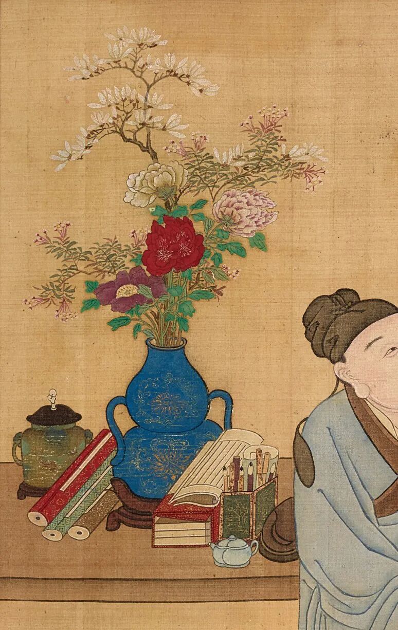 再说其变。据名物学家扬之水先生研究认为:桌椅的配合使用,始于晚唐五代,而士大夫家宅中室内陈设的如此变化至北宋中期才大致完成。随着高坐具各式家具的发展成熟,书房里的书案变得高而且宽大,花瓶得以在其中占得固定的位置。