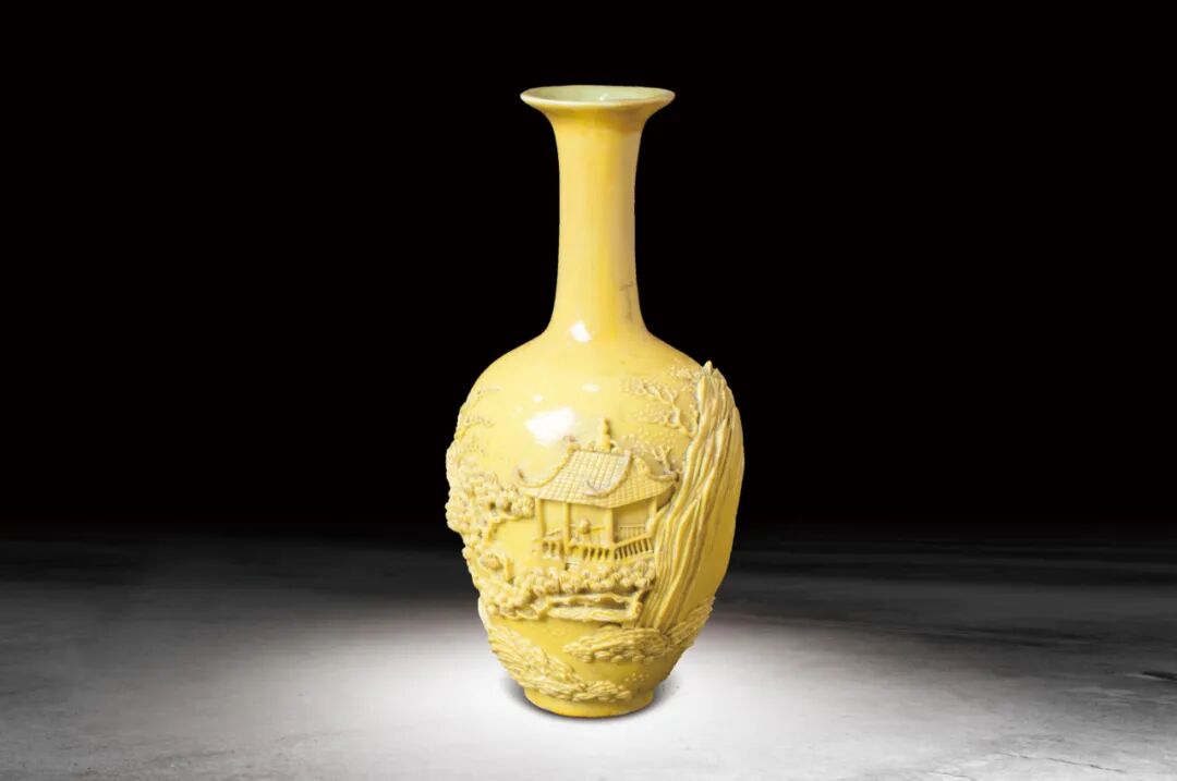 16 清 黃釉瓷雕山水紋瓶