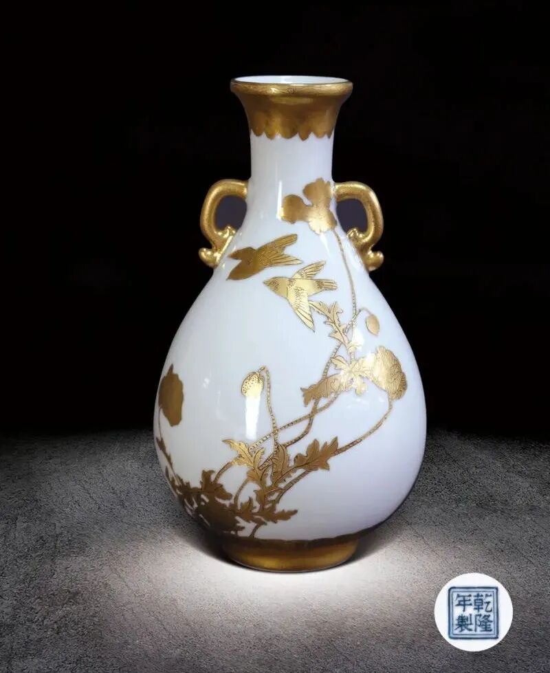 11 清 白釉描金花鳥紋雙耳瓶