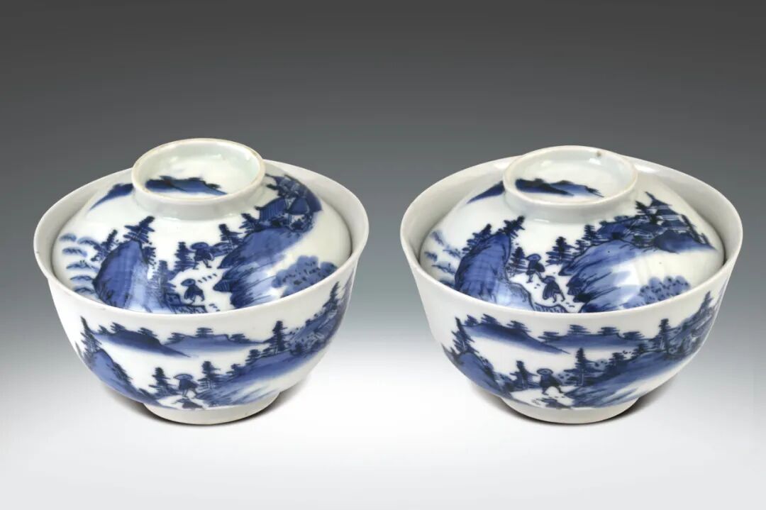 36 清 青花山水紋蓋碗一對