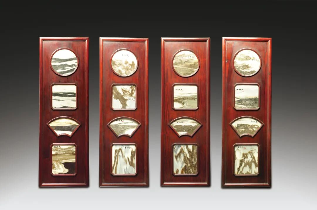 213 清 酸枝木鑲雲石十二景掛屏一組四件