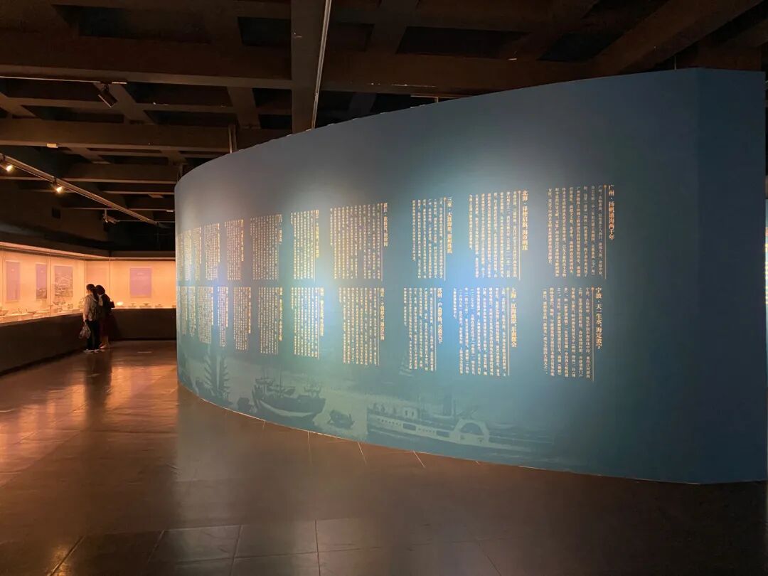 第一单元“港通四海”,于序厅弧形墙面上对申遗联盟的26个城市进行简要介绍,这些城市包括广州、宁波、南京、漳州、莆田、江门、丽水、阳江、扬州、福州、蓬莱、北海、黄骅、汕头、三亚、湛江、潮州、南通、连云港、苏州、淄博、东营、上海、威海、澳门、长沙。