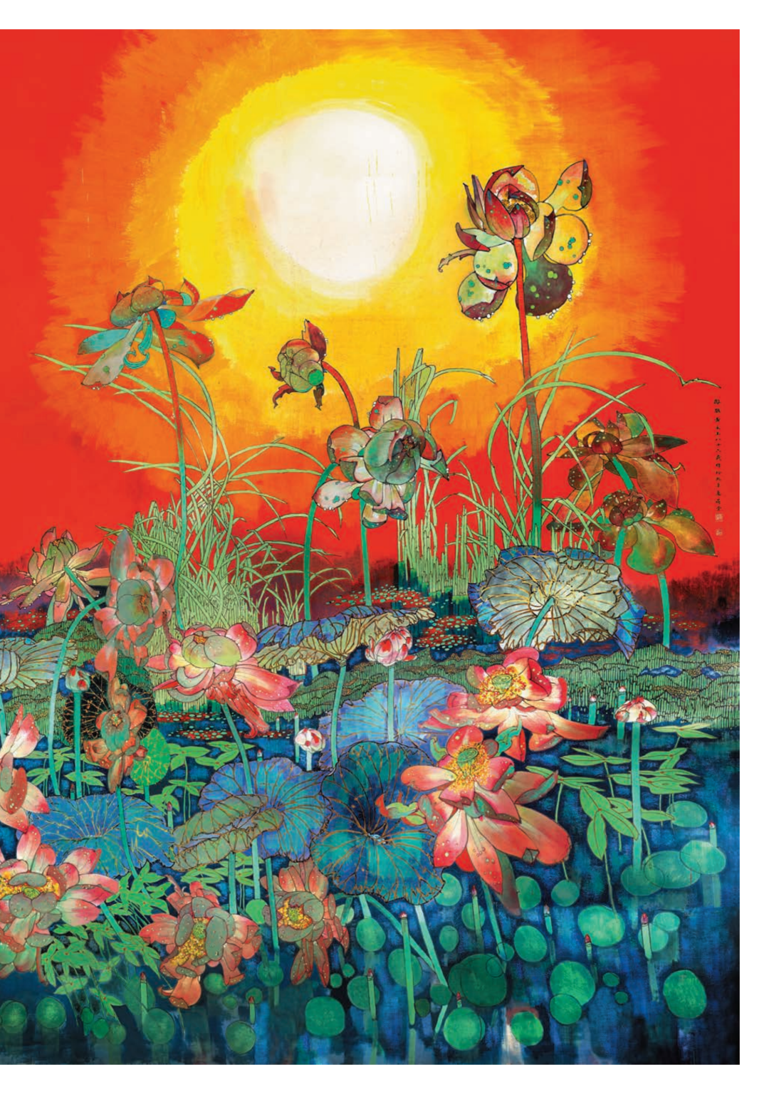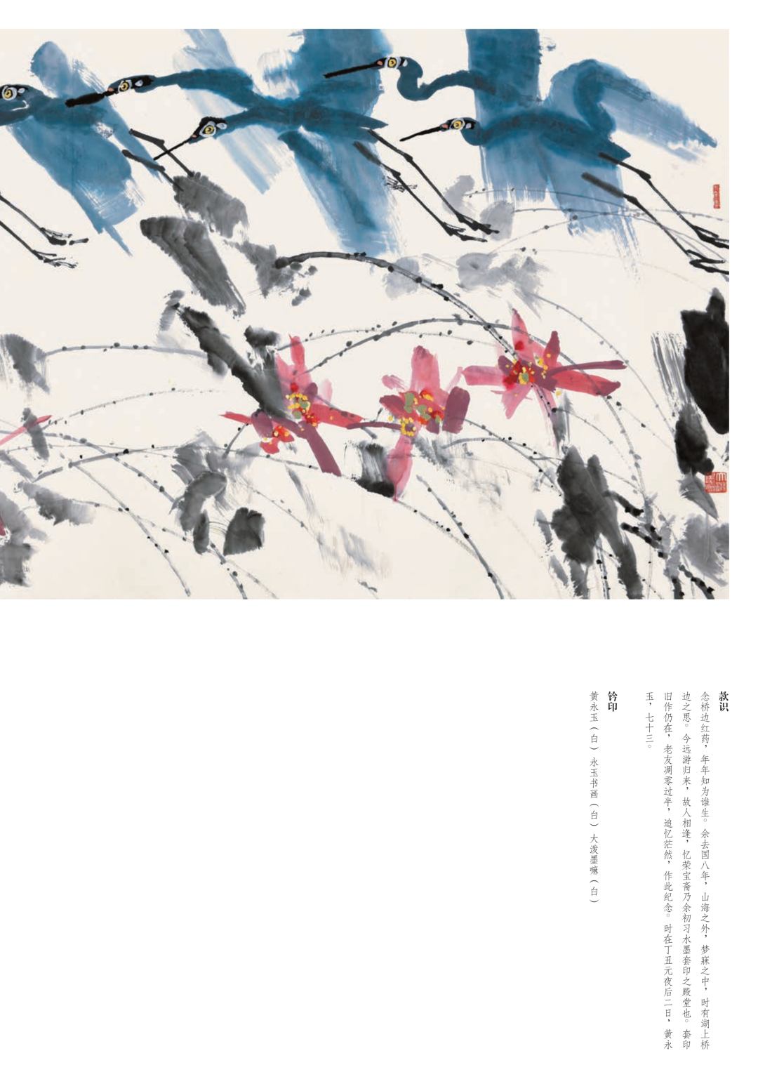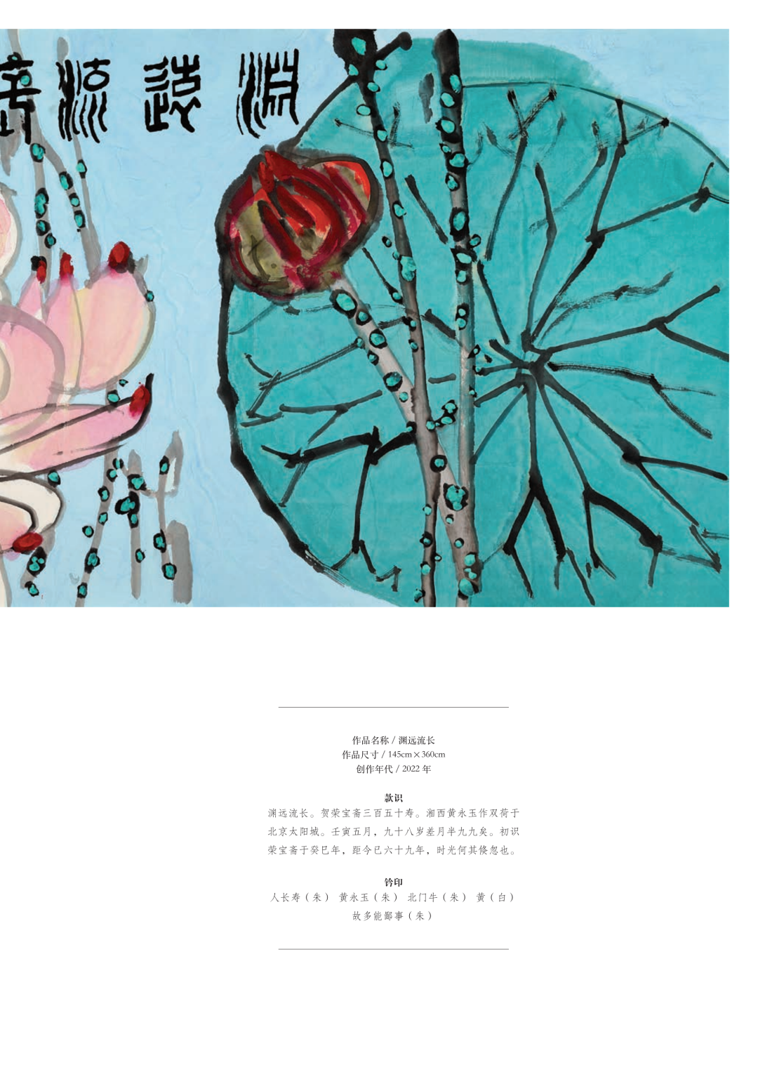 “ 渊远流长。贺荣宝斋三百五十寿,湘西黄永玉作双荷于北京太阳城,壬寅五月,九十八岁差月半九九矣,初识荣宝斋于癸巳年,距今已六十九年,时光何其倏忽也。” 这是黄永玉先生2022年为荣宝斋350周年纪念所画丈二荷花图《渊远流长》题跋中的一句话,从1953年黄老奉命到荣宝斋来学习木版套色印刷技艺以来,黄老与荣宝斋的情缘已经持续了整整69年。先生认为,他与荣宝斋的感情, 不仅感动了彼此,还让菩萨上帝们动了容,在1999年时他为荣宝斋所画的另一幅作品丈二白描荷花图《非荷》的题跋中即可体现,“ 余十年分别天涯来归,荣宝斋同仁主催余之画展,前后近年,奔波劳悴,费尽心力,不单我十分感动,相信连菩萨上帝见了都会动容。”