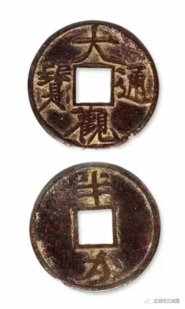 大观通宝,是北宋徽宗赵佶在大观年间(公元1107年至1110年)所铸造的年号钱。钱文为宋徽宗独创的瘦金体,铁画银钩,隽秀非常。