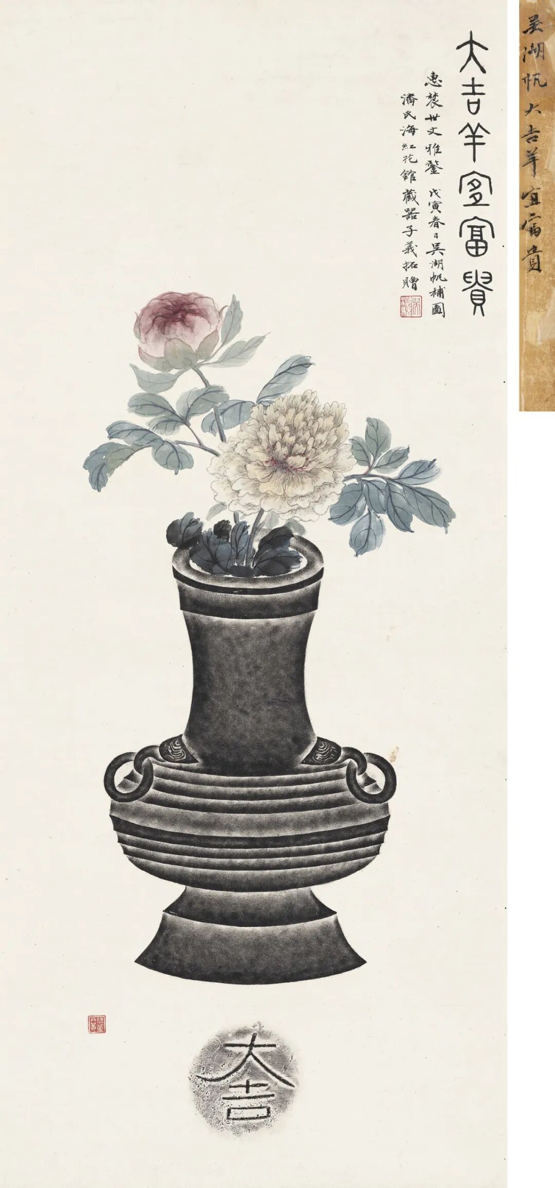 吴湖帆的没骨法“吴装荷花”独具特色,《博古牡丹图》中的牡丹便以其绘荷同样的没骨法写来,糅合了工笔的雅致精微与写意的水墨淋漓,层次丰富,清透氤氲,即使时隔近一个世纪仍然鲜活,一派盎然生机。青铜器与牡丹这一主体置于画面中央,器物的墨色让画面有了重心,更显错落有致的双色牡丹婉约清贵。随后浅浅拓印上壶底“大吉”二字,附上美好寓意。最后在画的右侧空白处题跋,画面整体清新端庄,古朴雅逸。