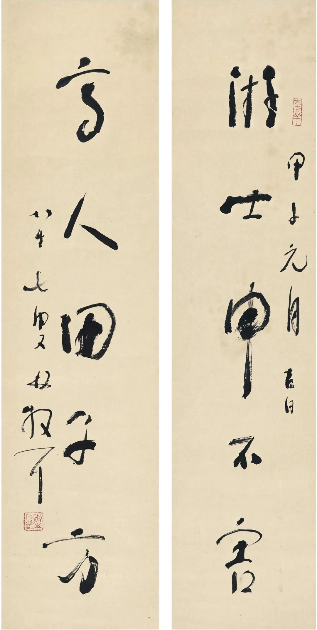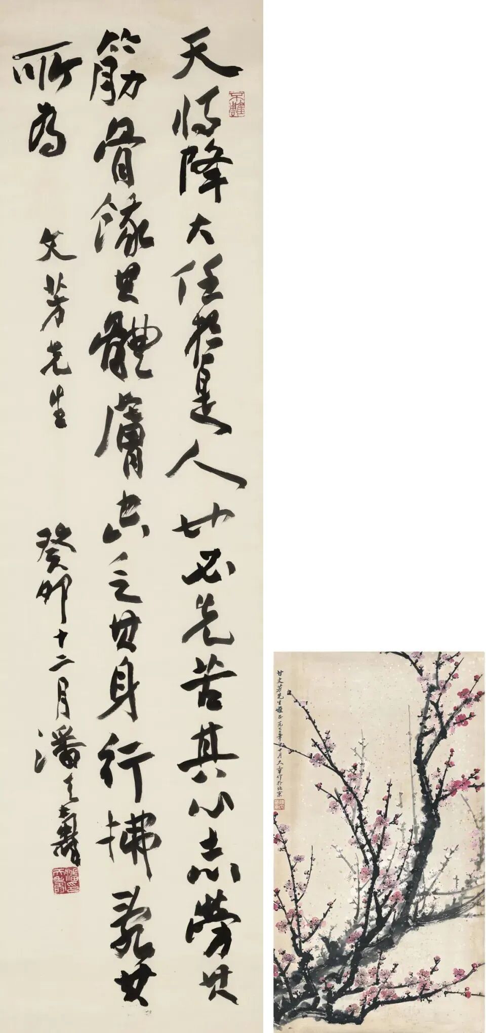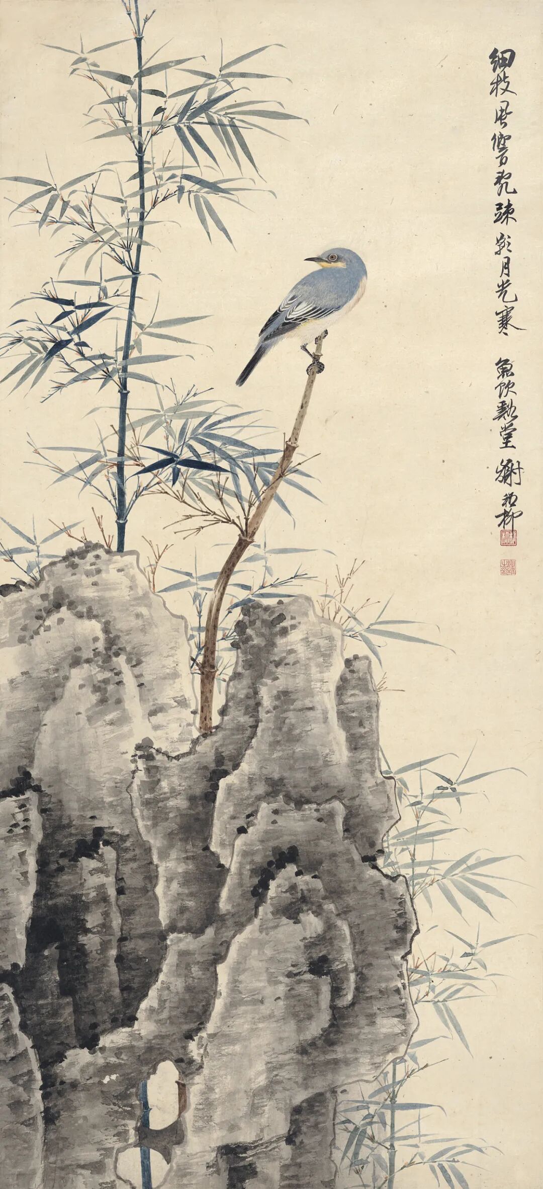 本幅作品为潘天寿早年双指之作,大约作于上世纪二三十年代。潘老早年指画作品存世较少,指书书法则更为罕见,像本幅这样完整的指书指画一对的,更可珍贵。