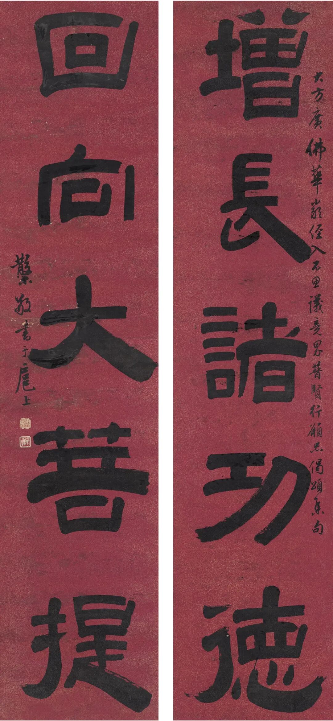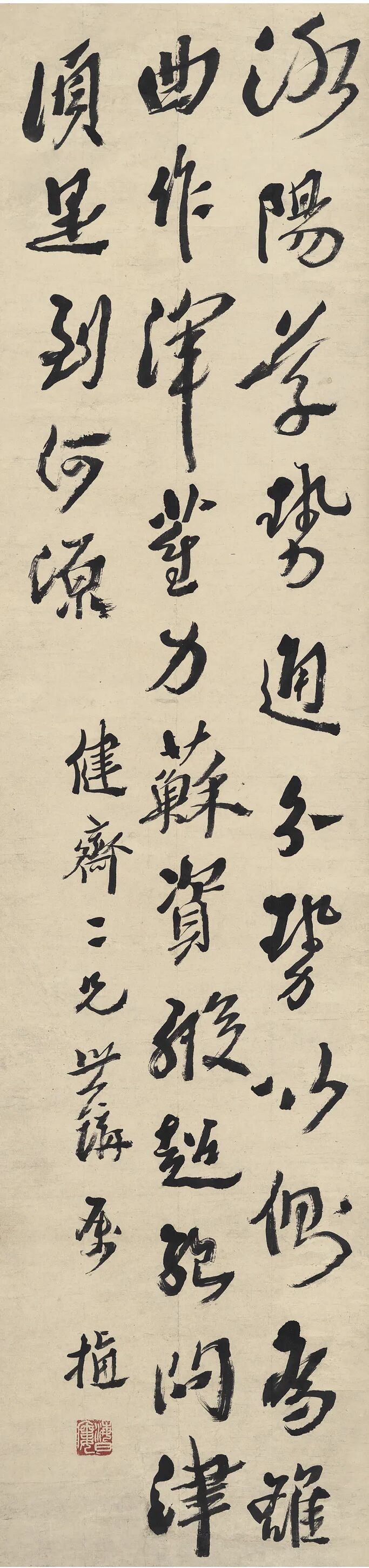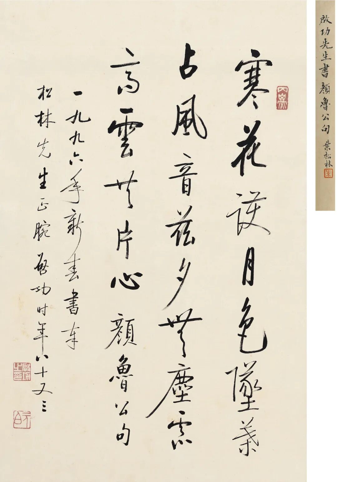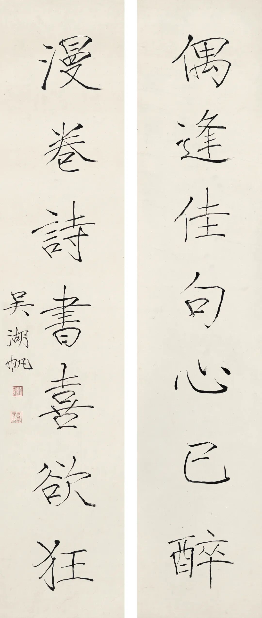 本幅作品为潘天寿早年双指之作,大约作于上世纪二三十年代。潘老早年指画作品存世较少,指书书法则更为罕见,像本幅这样完整的指书指画一对的,更可珍贵。
