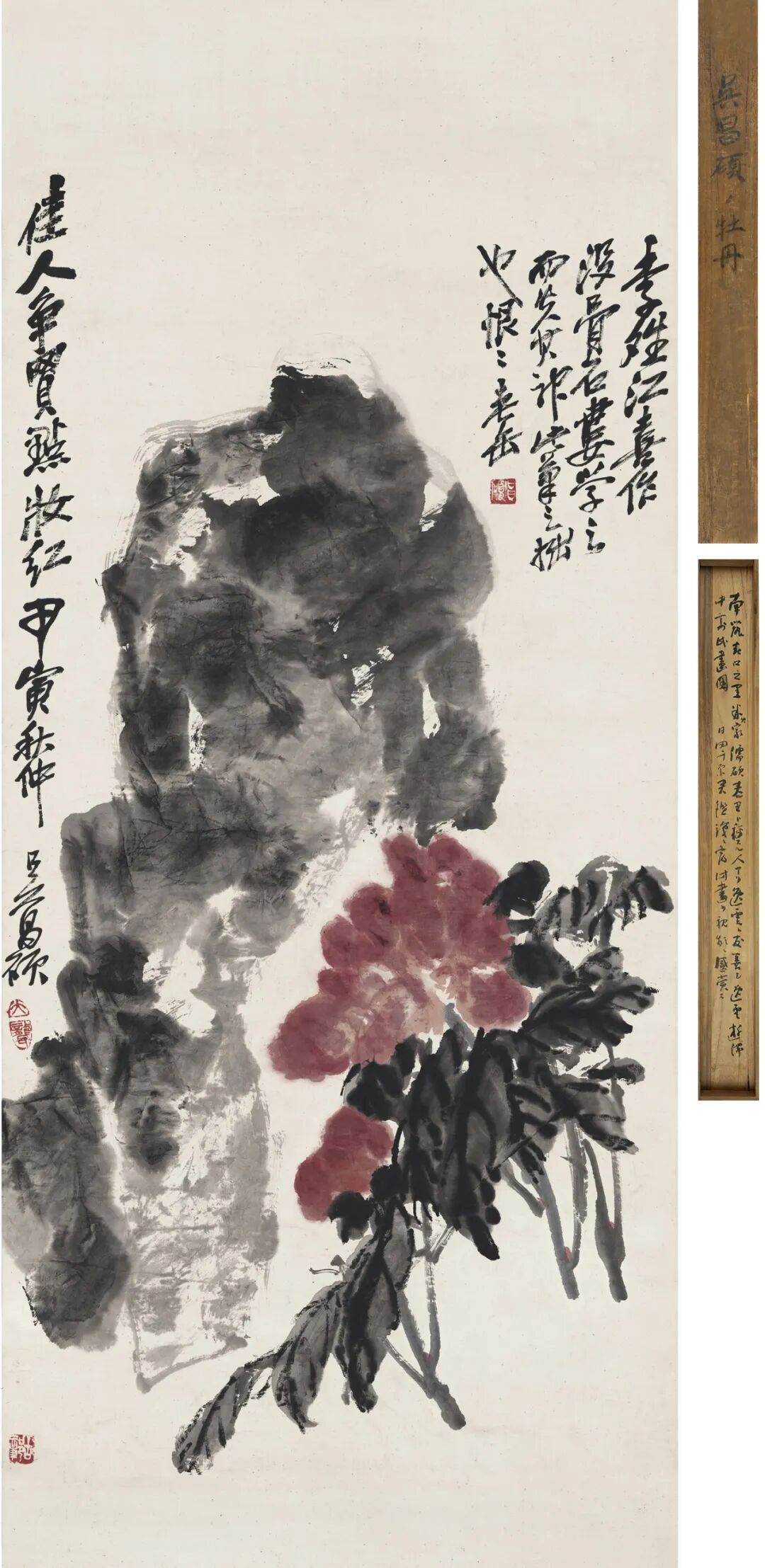 此幅灵石与花头皆以没骨法为之,吴昌硕以没骨法画花相对多见,以没骨法画石则鲜矣。其以没骨法绘写此灵石,墨色交融,形态质朴,自然生动。因吴昌硕绘画从书法中出,故其没骨画相对其它画家而言更多了些许厚重,少了一丝甜腻。