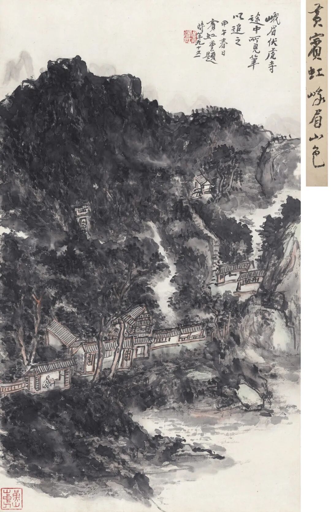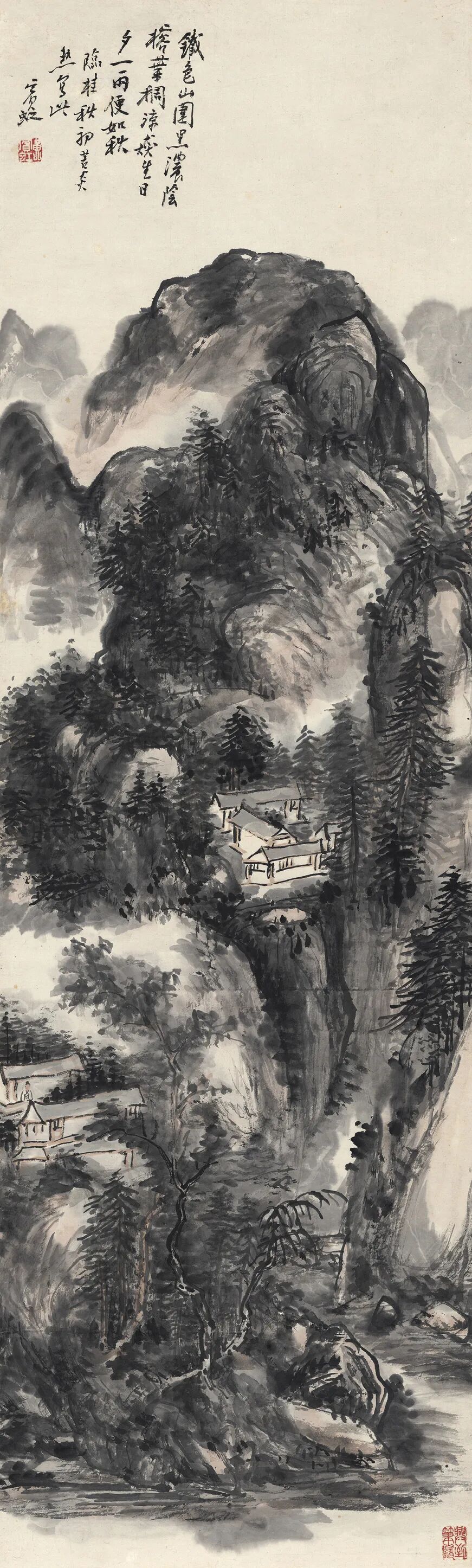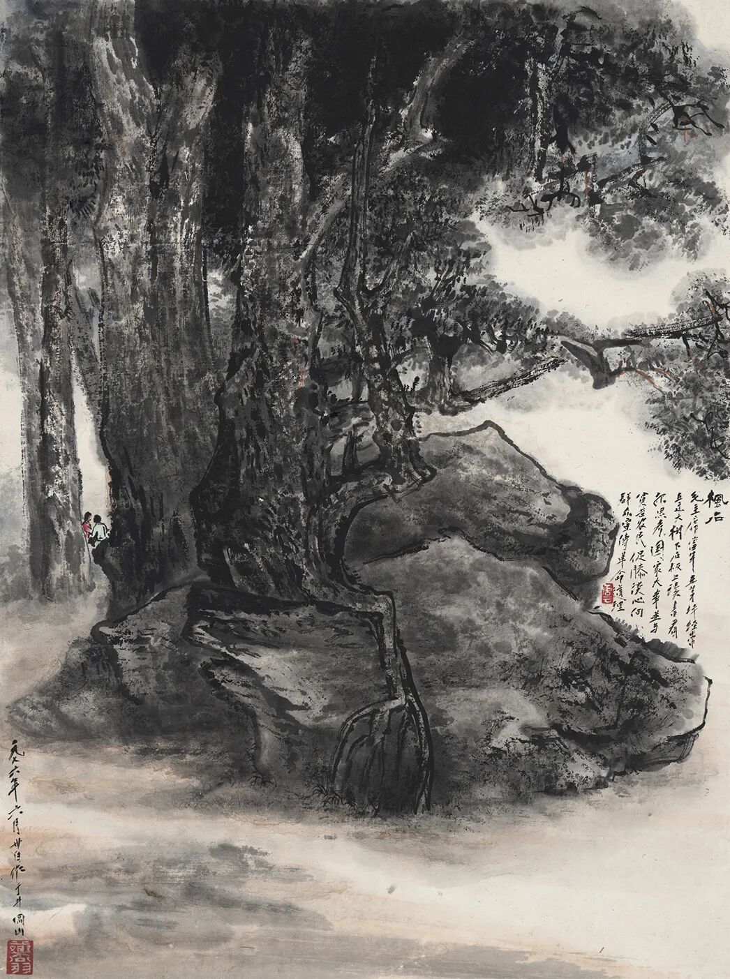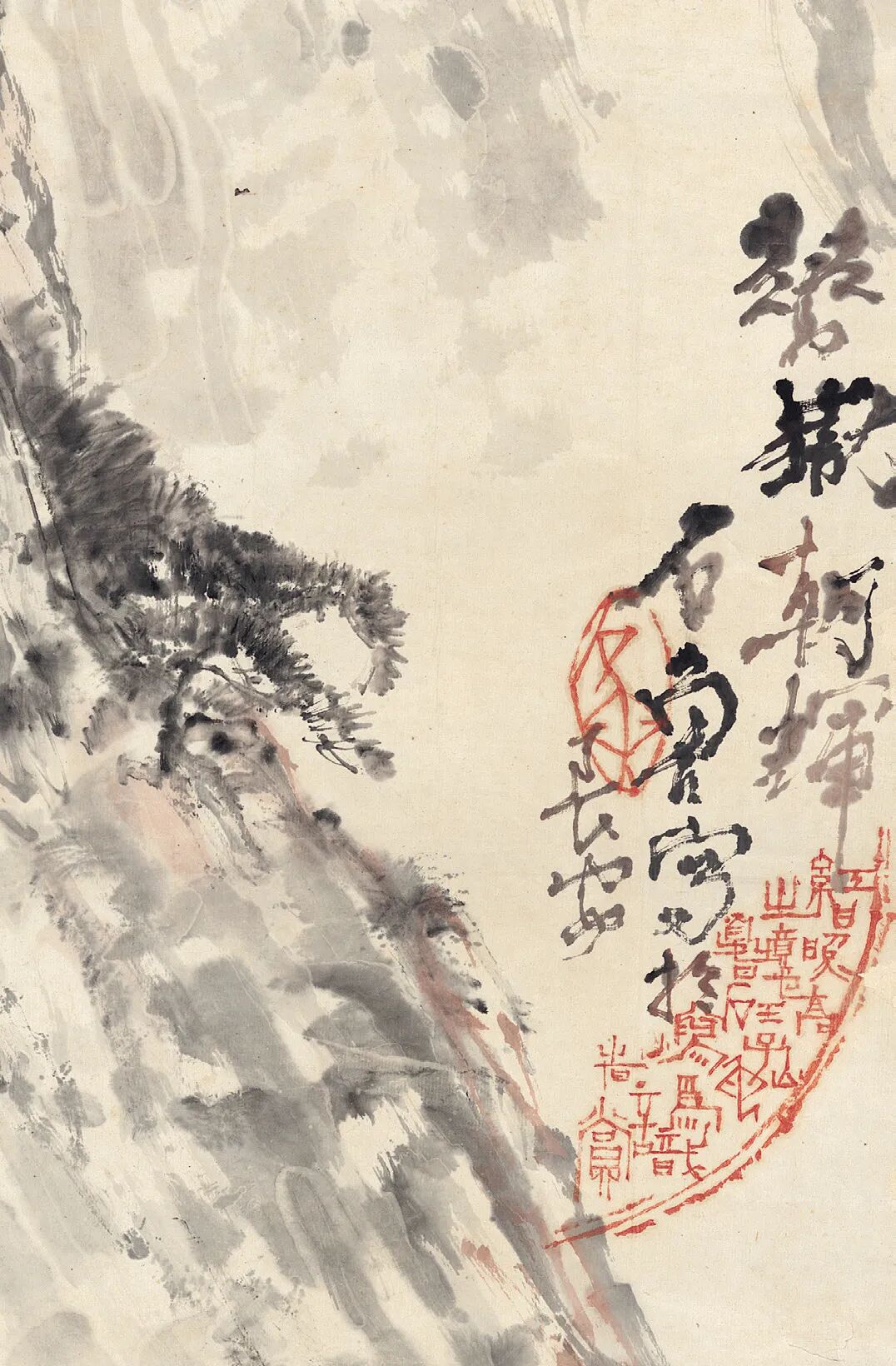 本作约创作于黄宾虹八十五岁左右,此时宾翁虽力求浑厚华滋,但实际上处在世祚鼎革的非常时期,他淡泊于世的心态不无自觉地表现在他的审美旨趣中。浑厚华滋的极端之处亦是对断山残水的另类演绎,新安画派出世遗民的逸笔率汰,无论是石溪、梅清的怪异狷介,亦或是萧尺木的荒率灵动才是黄宾虹真正的精神指向,由此本作可见一斑。