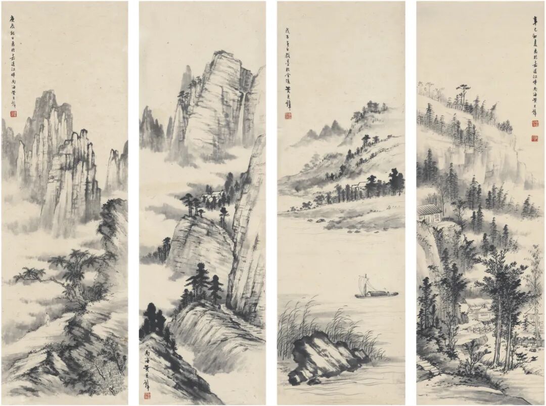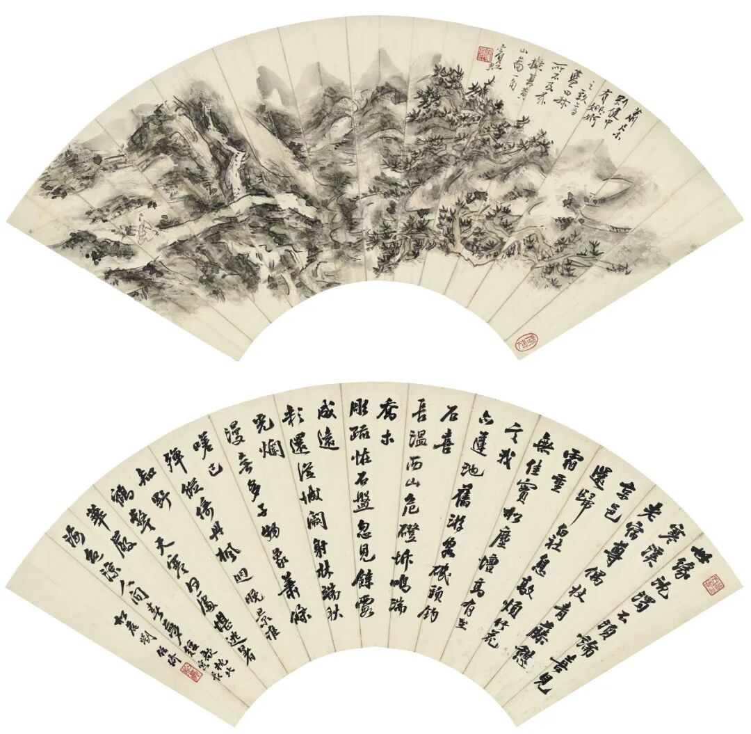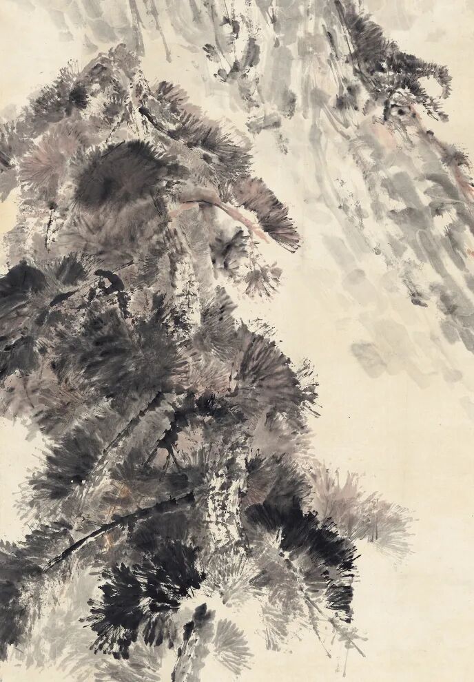 作为博采古人、取精用宏的近现代山水画大师,黄宾虹向来强调新安画派的旨趣,并以此为皈依而殉道终生。在他的作品中,黄山形象这一母体反复出现。无论是仙风道骨的远山,亦或是怪石嶙峋的松石丘壑,都是宾翁继承并发扬新安画风的精神依存。本作即黄宾虹借新安巨匠萧云从之笔意,对发扬新安画风所做出的究极衍变。诚然,画面中宾翁以舒朗健逸之笔法所营造的萧疏淡远之境,正如舆古人展开的超时空对话。而款中所言舆浙派殿军蓝瑛之比较,亦是两种截然不同画风的正面冲突,萧瑟婀娜的新安古风以及格融雅艳的浙派武林风皆是画家血战古人之抉择,这一切对于生在徽州居在浙江的黄宾虹而言,恰似他直至晚年仍在展现自己究其一生所追求的身份认同舆归属感。