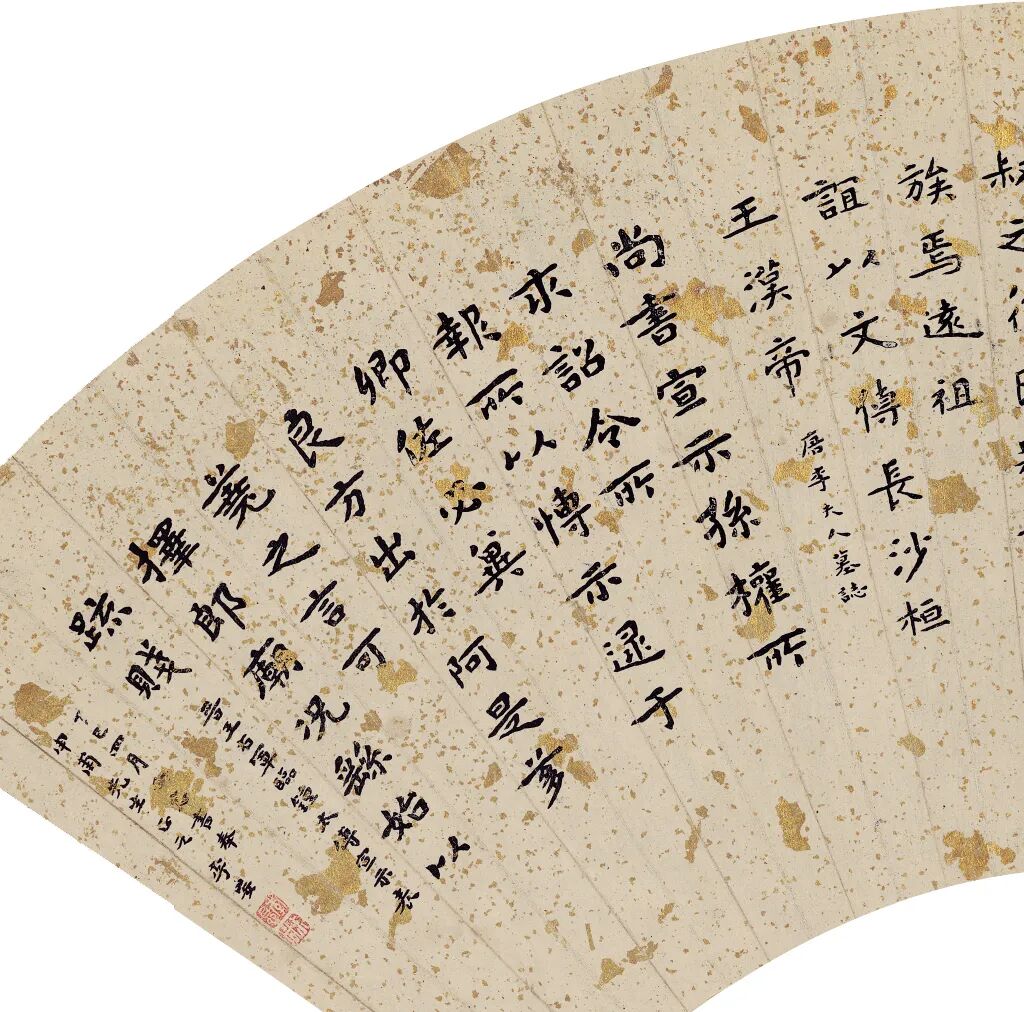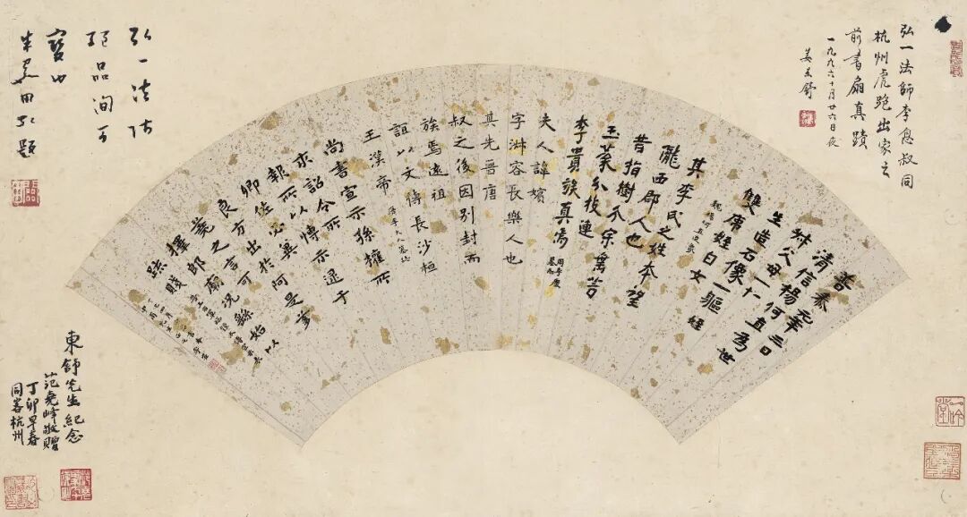 此弘一法师《楷书临古四种》创作于1917年4月,此时大叔刚刚皈依于虎跑寺了悟法师,为其在家弟子,取名演音,号弘一,俗名则由李叔同改为李婴,毫不夸张的说创作此扇时弘一法师正处于人生中最关键的时期。而将四种魏碑书体汇聚于咫尺扇箑中,更是弘一法师早年墨迹中的罕见创作,或可视为法师在俗书风之总结,而最初得到此扇的堵申甫先生亦非一般人物。