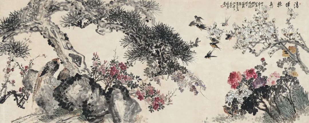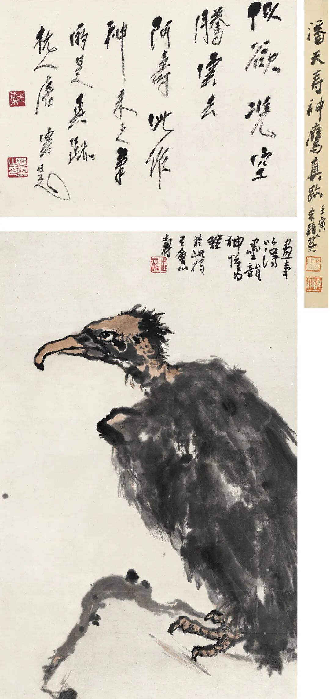 《鹰鹫图》在这一时期的作品中主题突出,不仅具备小幅作品的笔墨精妙,更兼具大幅作品的撼人气势,或为创作重要大画时穿插所作。是代表潘天寿创作生涯重要时期的佳作。