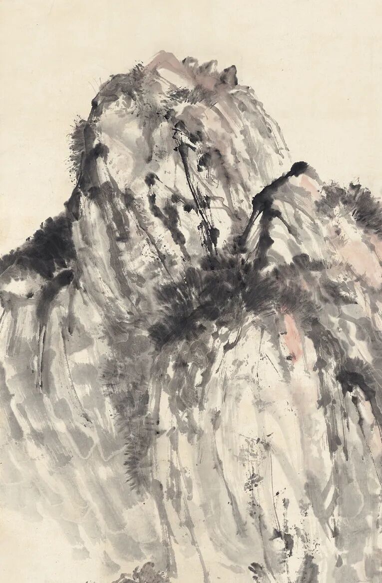 《华岳朝晖》图正是如此,淡墨色的山石古松表现出日出之前华山的如睡山色,象征着石鲁在经历苦难后疲惫的精神与身体状态的昨天。