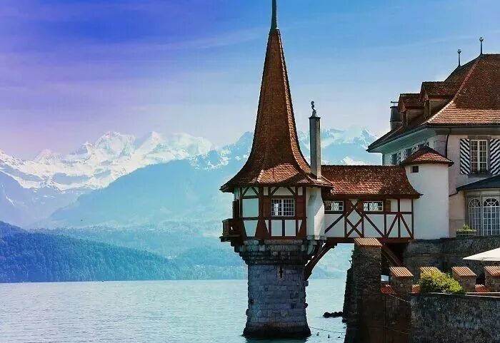 这座奥伯霍芬城堡及其塔在水上,位于瑞士图恩湖的右岸。它可以追溯到 13 世纪