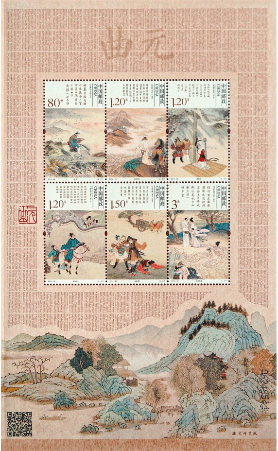 票面以宋末元初的画家钱选所作的《山居图》为边饰,版张的中心位置以《天净沙·秋思》《山坡羊·潼关怀古》《窦娥冤》《墙头马上》《赵氏孤儿》和《倩女离魂》六部元曲作为邮票内容。