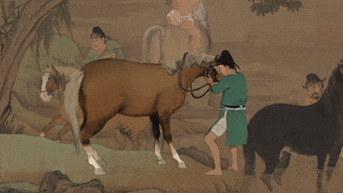 图中描绘夏日疏林间,奚官在水塘为骏马洗浴纳凉的情景,人物与马各具姿态,人物衣纹流畅,树木坡石勾勒简练。