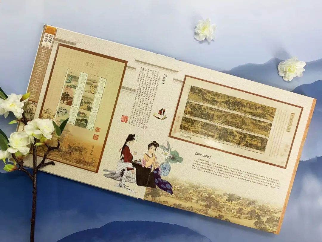 《诗情画意》邮票珍藏册,结合传世佳作,展现中国之千年风雅,传达中国文化之精神、中国文人之风度。一览,千年经典融入方寸之间,藏之,则是对中国传统文学的纪念。