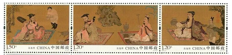 《诗经》以山水画为背景,小全张形式设计,涵盖《风》《雅》《颂》三部曲。邮票精选了《周南·关雎》《秦风·蒹葭》《秦风·无衣》《小雅·鹿鸣》《小雅·鹤鸣》《鲁颂·駉》六首脍炙人口的诗歌。