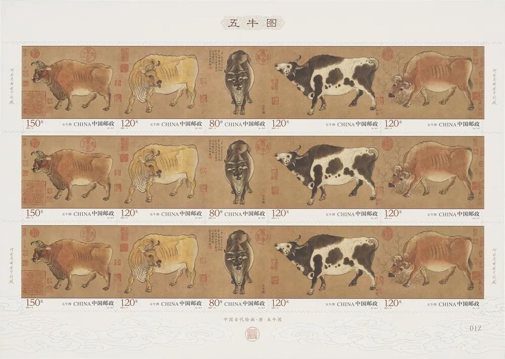 该套邮票根据五头牛在原画中的布局采用多样化的票幅设计,整体设计古朴典雅,邮票微雕模切齿孔工艺与小型张无齿孔设计相结合。在方寸间,重现了《五牛图》细腻精微、形神兼备的艺术特色。