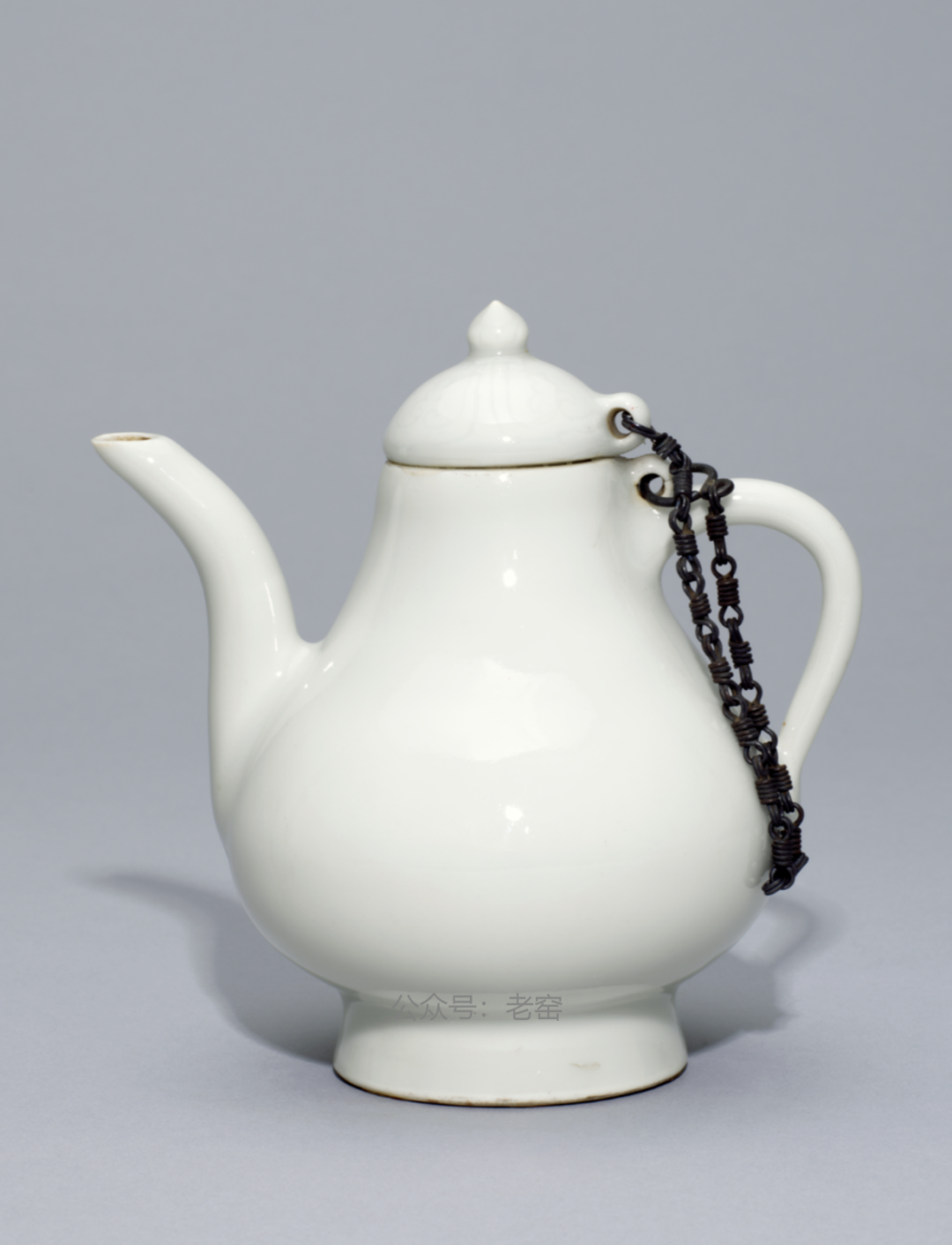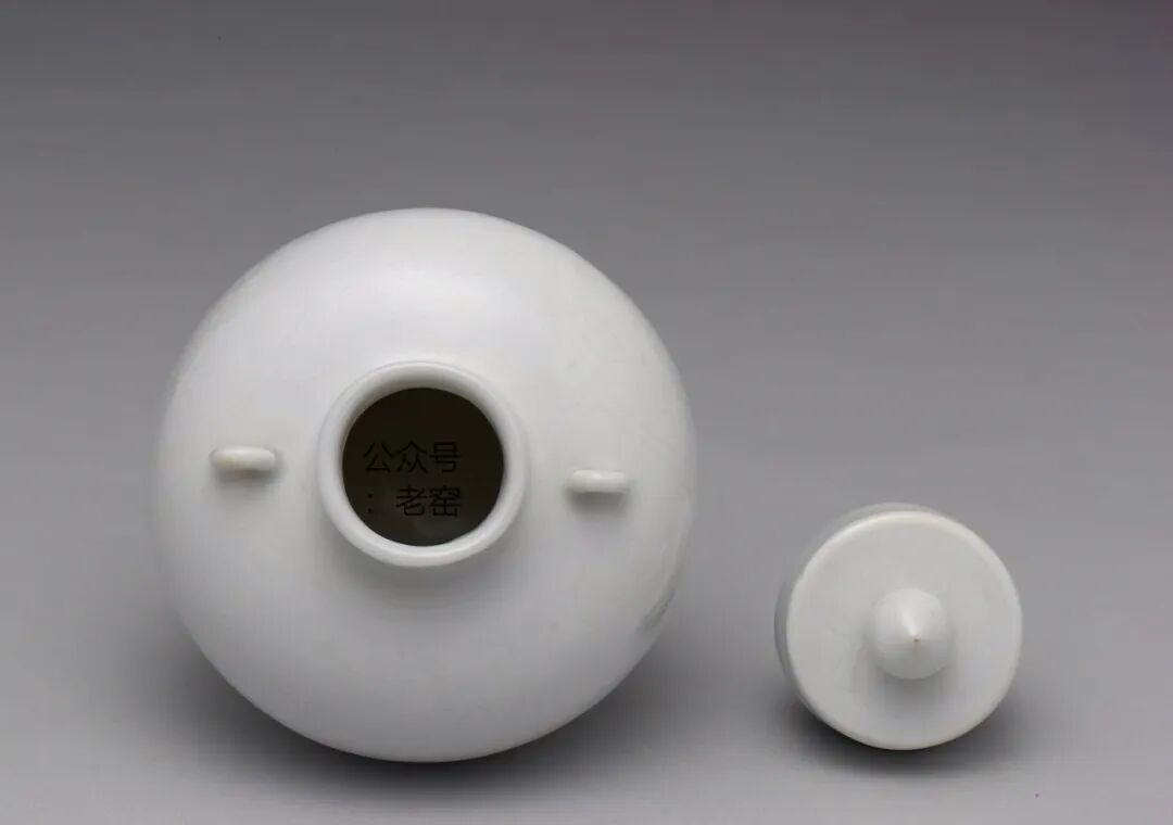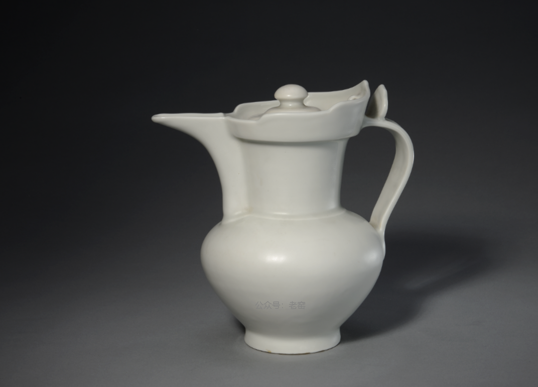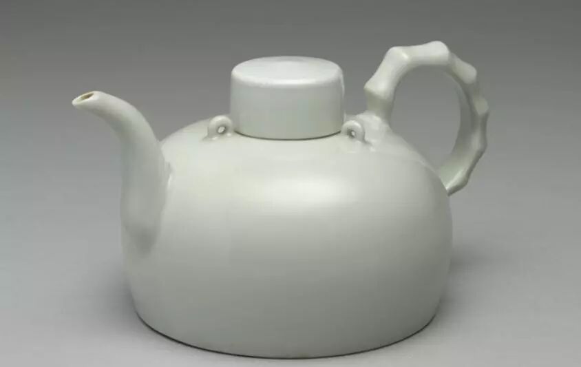 此件单把壶的壶身呈半球形,小口、短直颈、圆肩、器腹略内敛、平底、浅凹足。器肩上有三个环形繫钮,器身一侧带曲流,另一侧带竹节把手,并有一平顶直璧原形盖罩住口颈。全器除足底露胎外,均施以白釉。全器光素无纹,釉色洁白莹润。