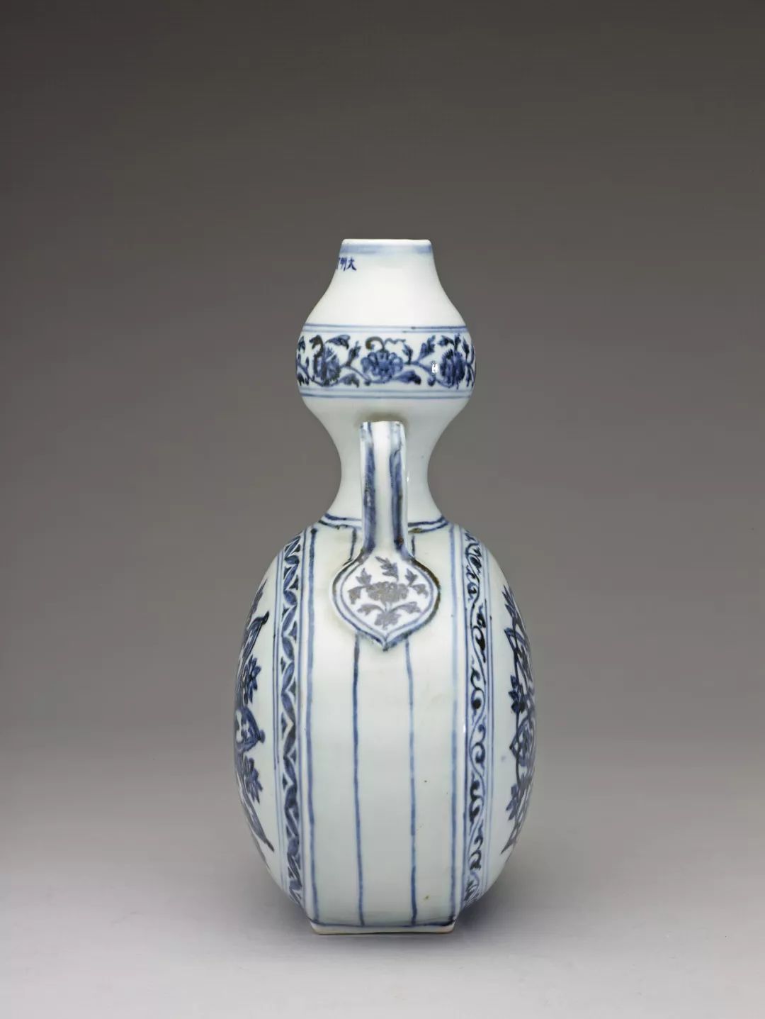 绶带耳扁壶是明代永乐、宣德时期生产不辍的器形。由这四件绶带耳扁壶的器形弧度比例、装饰纹样组合以及圈足的高低方圆,可以感受永乐到宣德之间同形器微妙的变迁轨迹。压手杯,是杯的一种样式。为明代永乐时期景德镇御窑厂创烧,制作精细,形体古朴淳厚,造型为口平坦而外撇,腹壁近于竖直,自下腹壁处内收,圈足。其形体端庄大方,凝重中见灵巧,手握杯时,于虎口处相贴,给人以稳重贴合之感。故有“压手杯”美称。
