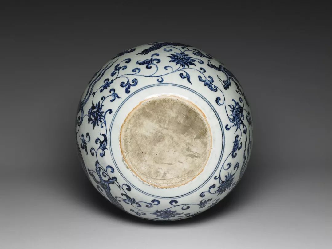 青花天球瓶硕大浑厚,器身环绕威武雄猛的穿莲三爪行龙,整体气势堂皇庄重,是国立故宫博物院所藏永乐青花瓷器中的名品。