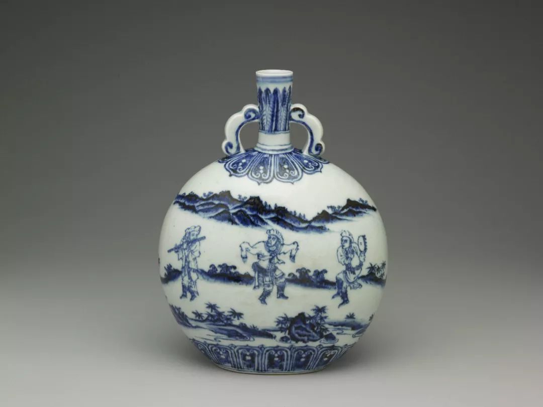 明永乐 青花人物纹如意耳扁壶 关注公众号:高古瓷