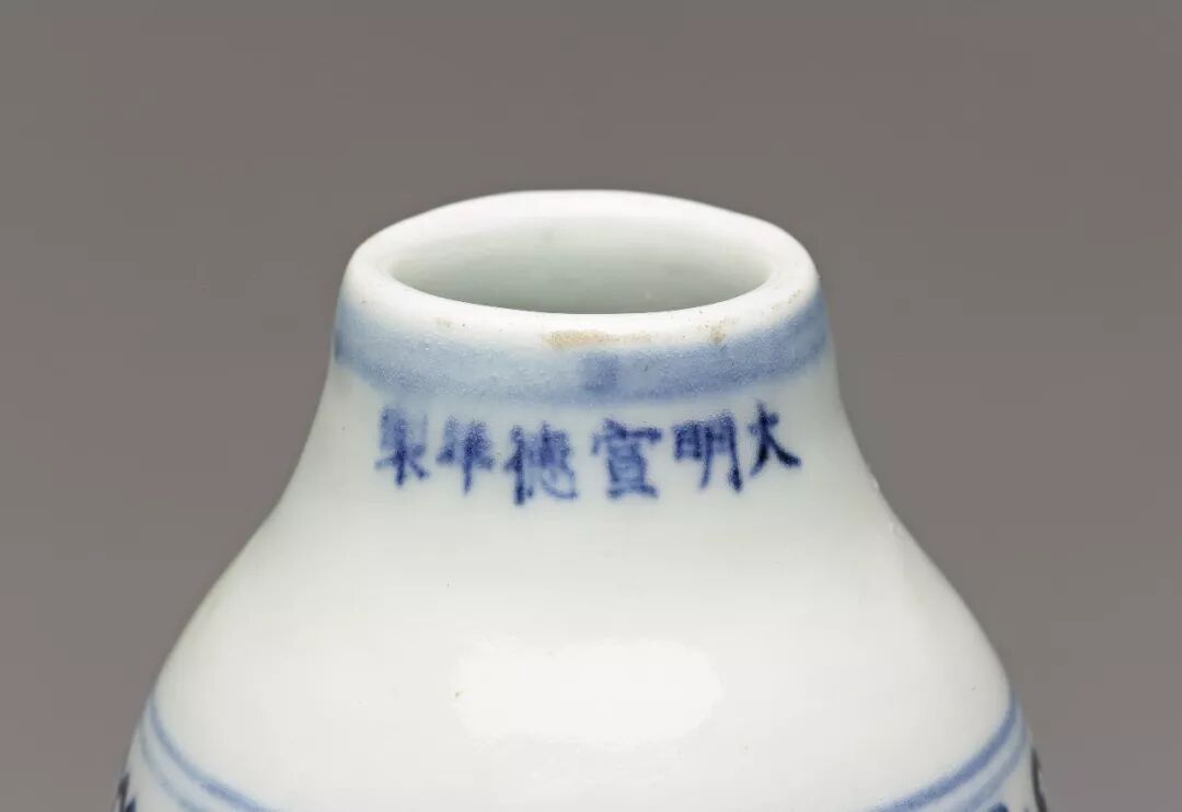 永乐、宣德年间,时有青花大型器如天球瓶、扁壶等作品的烧制。青花瓷器是以含氧化钴的矿物为颜料,在瓷器坯体上描绘纹饰,施一层透明釉后,经约摄氏一千两百度左右高温烧造而成的作品。明代永乐、宣德时期的青花发色浓,并且带有渗青铁鏽斑点,形成独特鲜明的风格,且成为清朝早期製作永乐宣德青花仿古瓷时的模仿重点。
