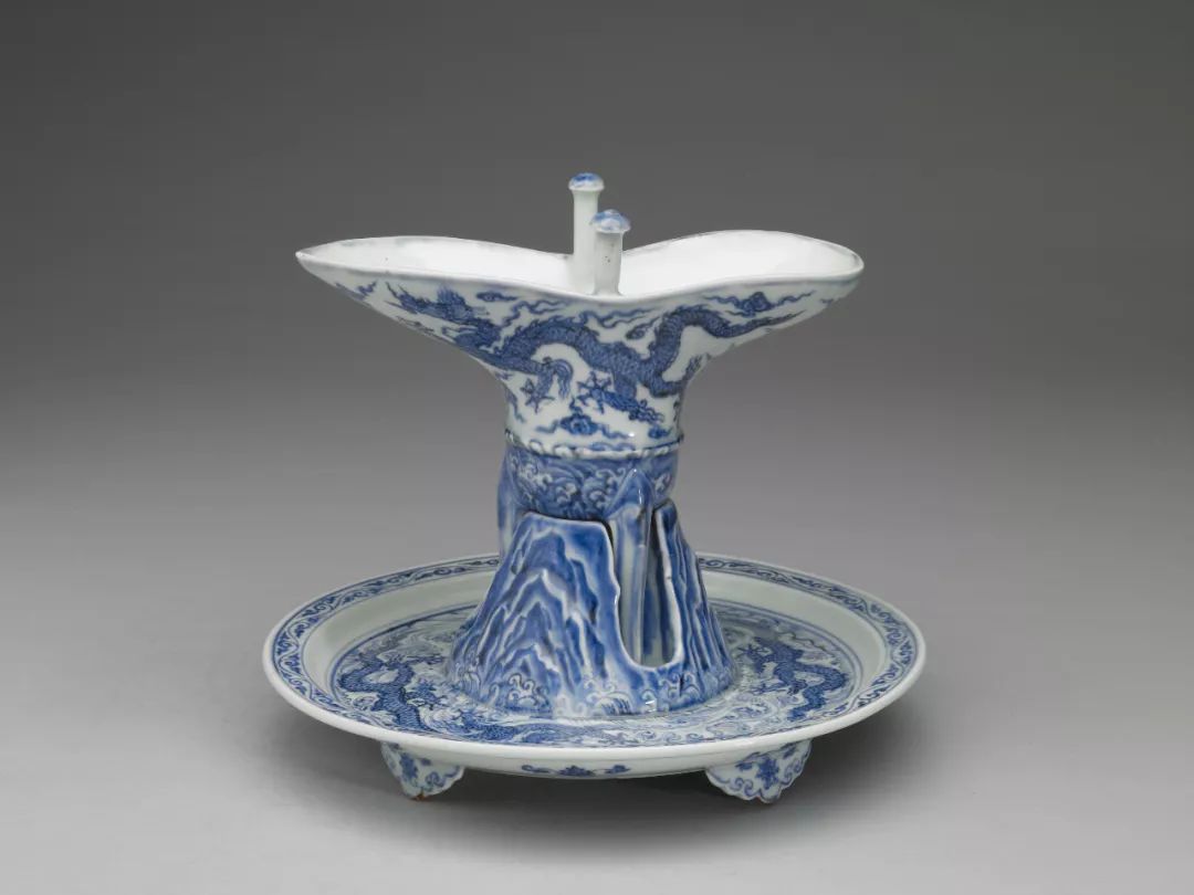 青花爵杯搭配山形托盘首见于明代永乐时期。爵杯仿青铜爵器形,前有椭圆流,后带尖形尾,左右有双柱立于口沿,器腹下承三足。托盘折沿、平底,底有四如意形足,盘中央突起一座三山形支柱,三山之间略凹并有三孔隙,供瓷爵的腹部及三足歇放,所以也称“歇爵山盘”。