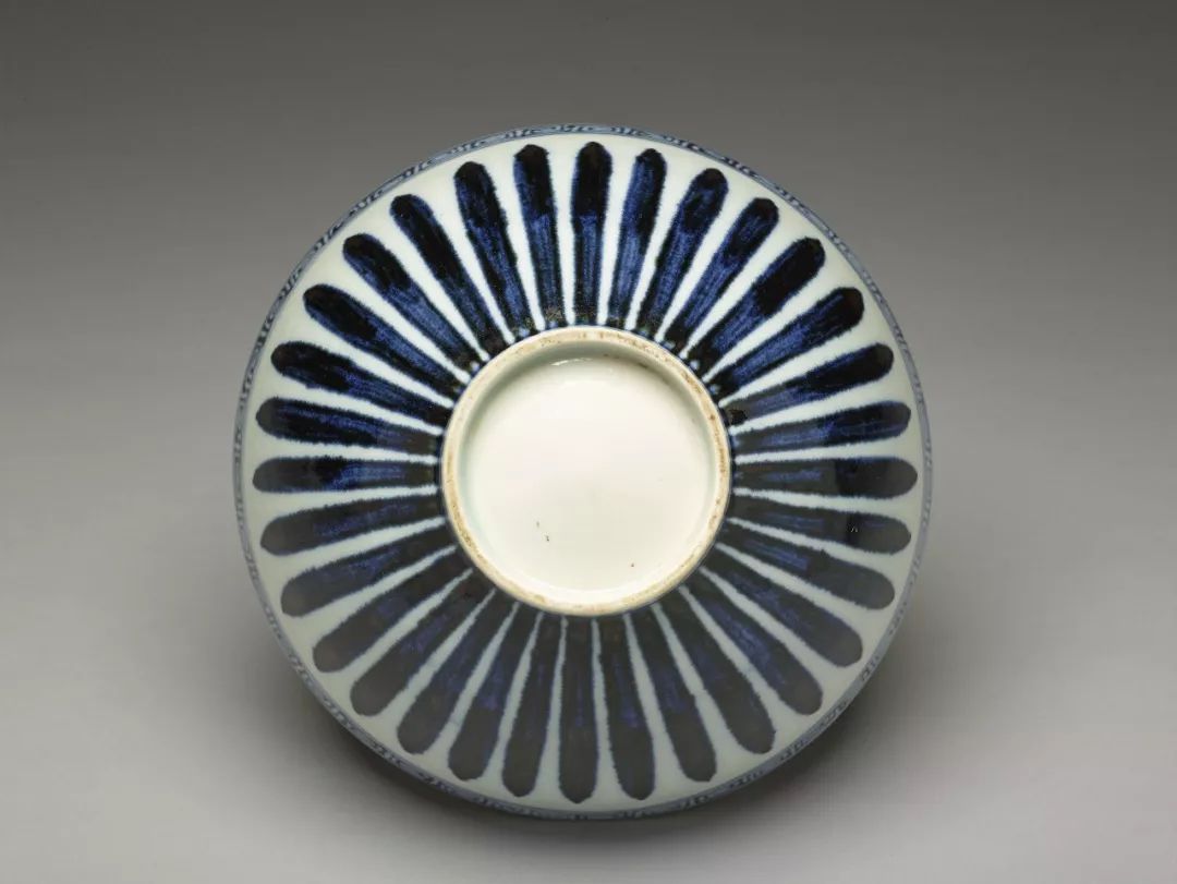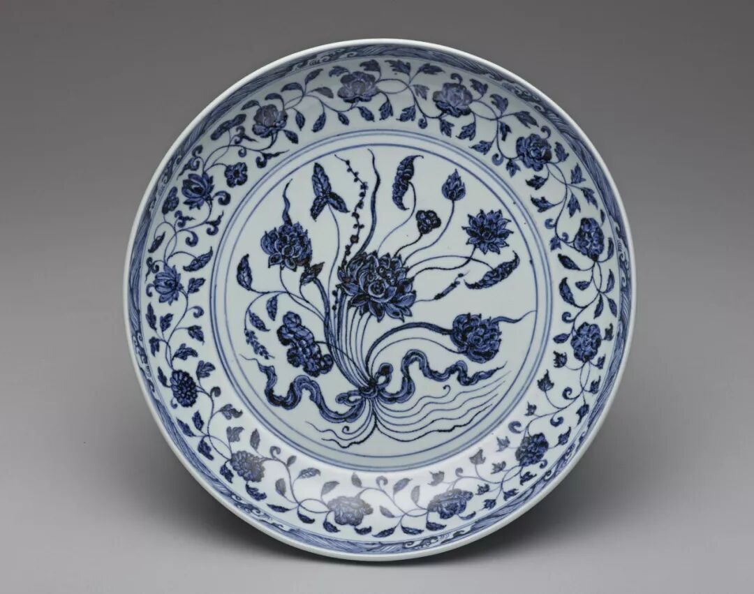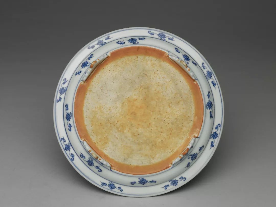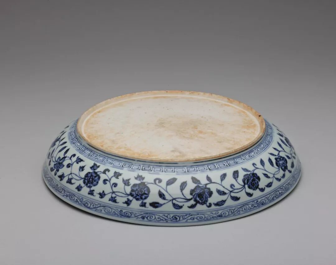 因为外交往来以及贸易交换等因素,土耳其的托普卡普宫殿博物馆以及伊朗的阿德卑尔神庙收藏有大量的十五世纪初期青花瓷器,类似这件作品的青花一把莲盘,在两大收藏中也都可以见到。在阿德卑尔神庙收藏一件同类型盘子,器底有“青花磬口花盘一样”及与价格相关记载的墨书,可以让人遥想其流通海外的情景。