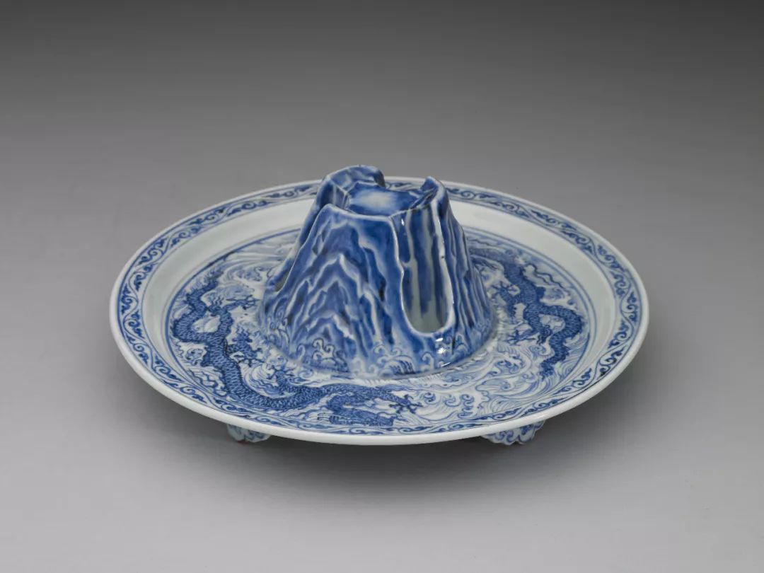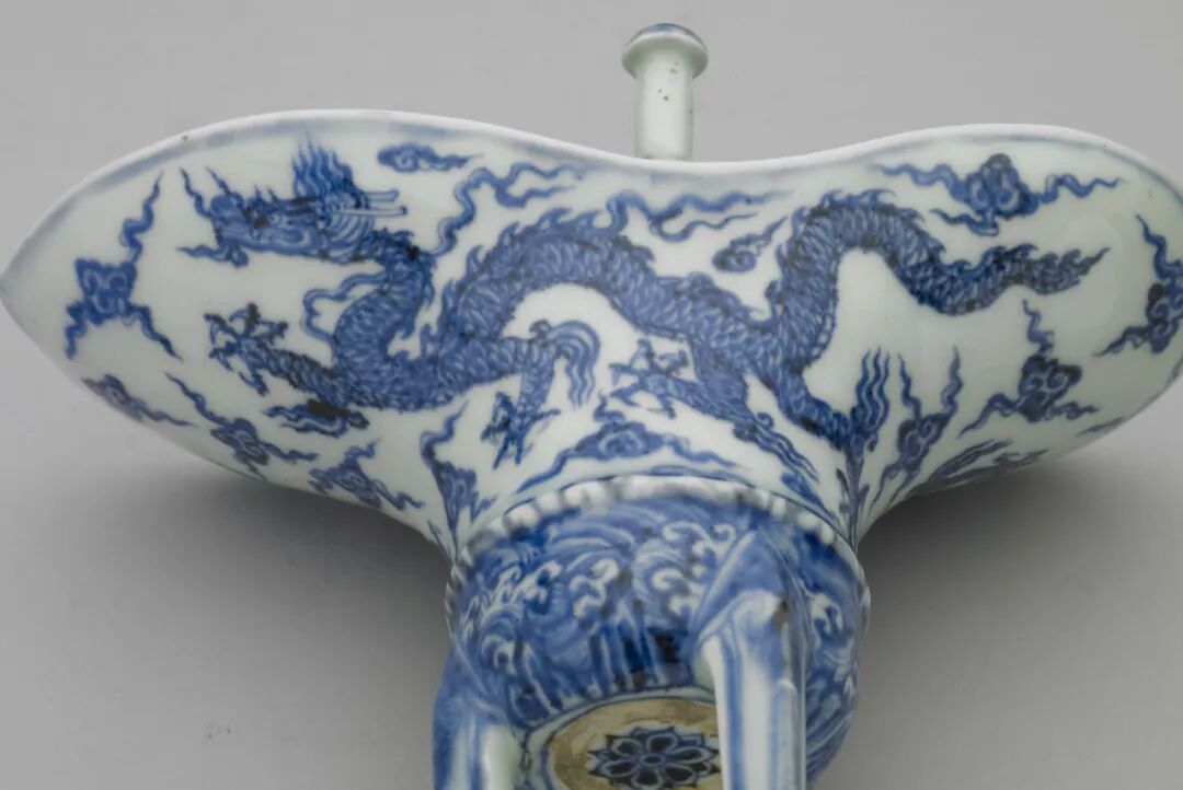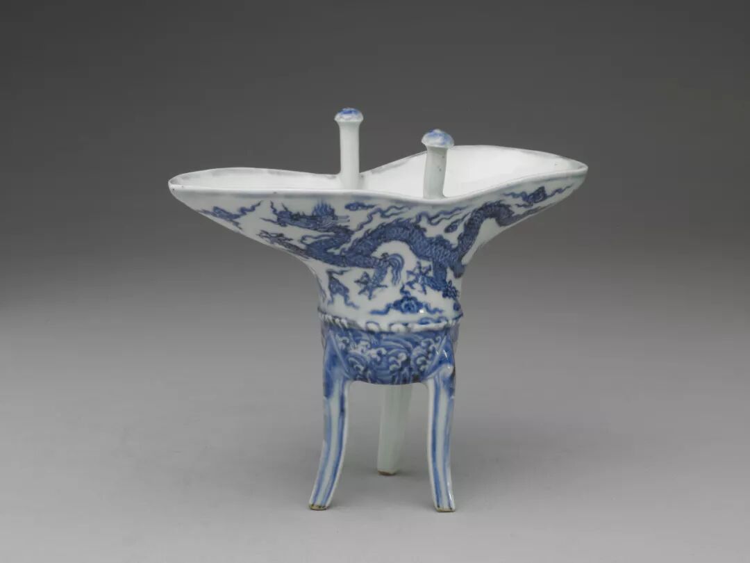 瓷爵的烧製始于元代。洪武元年(1368),明太祖朱元璋在谈论太庙祭器时,说:“共设酒尊三、金爵八、瓷爵十六于殿东西”,可以看出瓷爵在明初已是重要祭器。明英宗时,礼部尚书蒋守约也曾提到“大祀天地、社稷,旧制皆用瓷爵”,可以推想带有五爪云龙纹和海水江崖纹组合的瓷爵和爵盘,应该是永乐时期重要的家国重器。