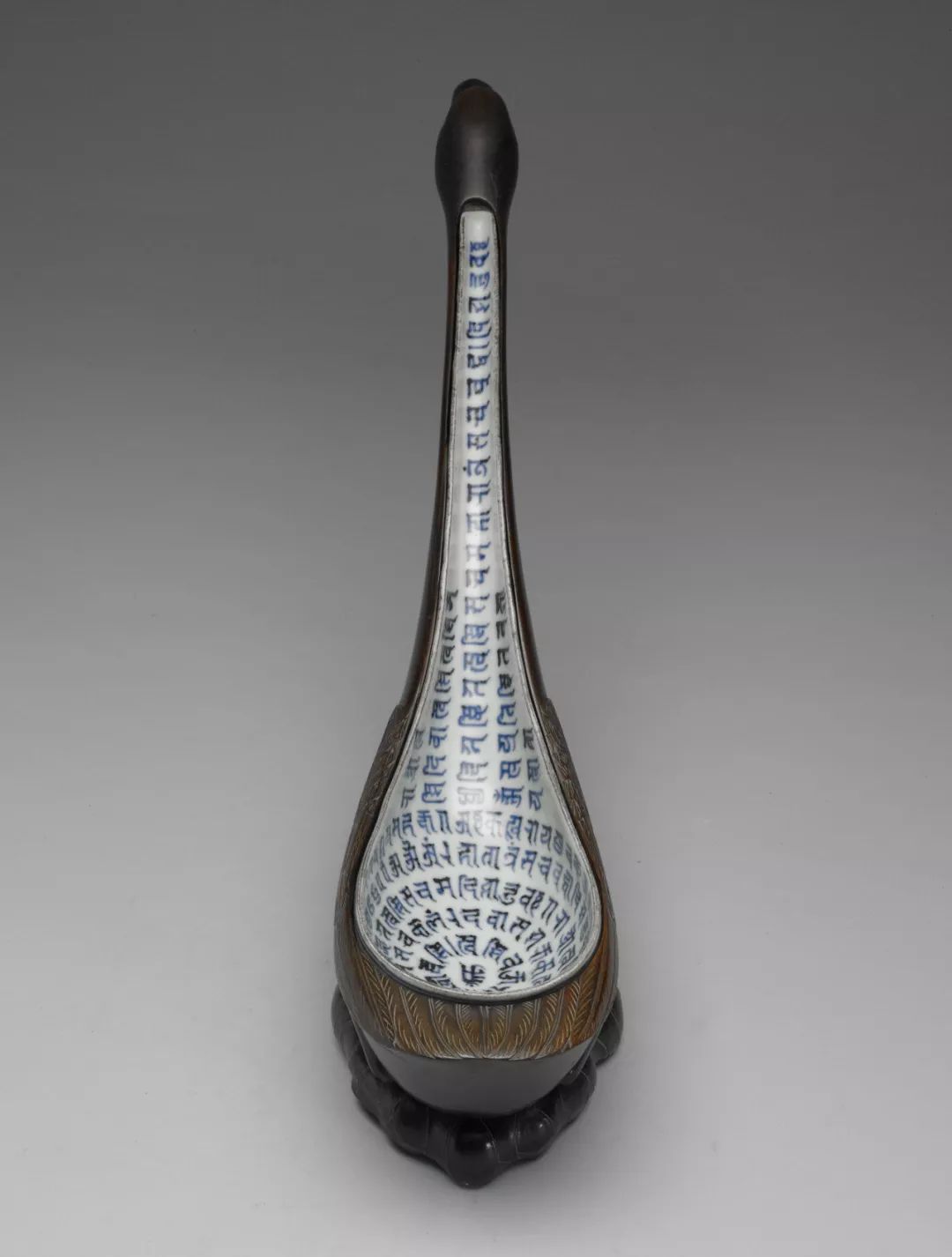 这是传世唯一一件永乐时期的瓷质大勺。这件勺子的尺寸极大,勺口宽而深,握柄细长。全器以青花为饰,器内满书青花梵文种子字,器外散点式分布二十四朵莲花。
