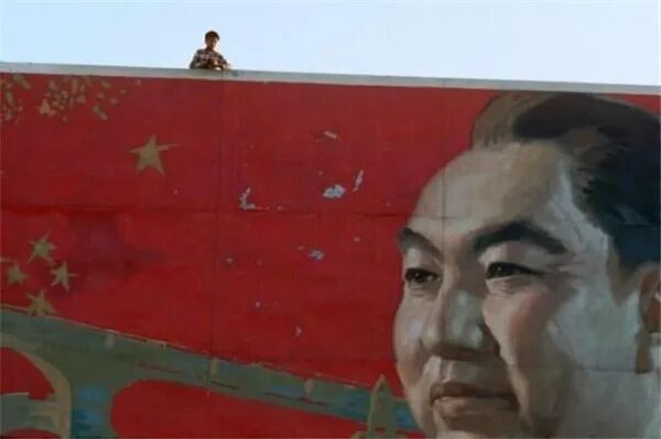 整面墙壁都是宣传画,一个少年站在楼顶往下看 关注公众号:高古瓷
