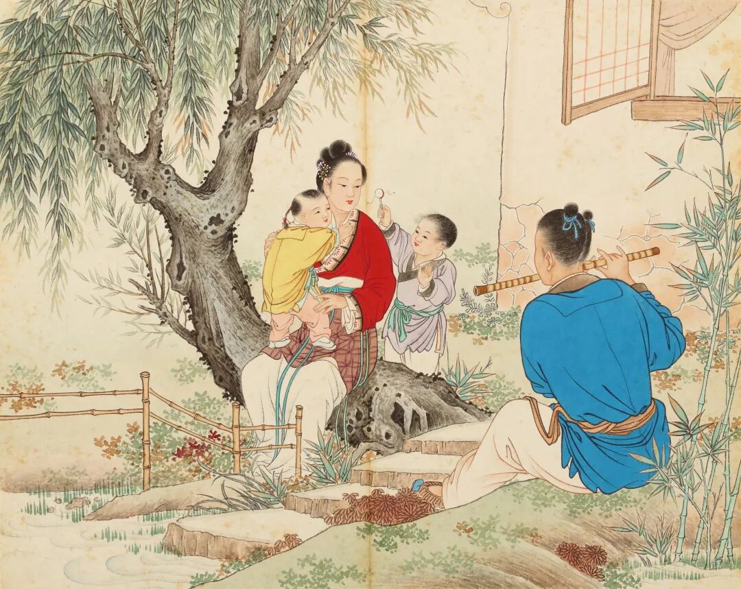 郎吹短笛妻抱子,合家欢乐度光阴。