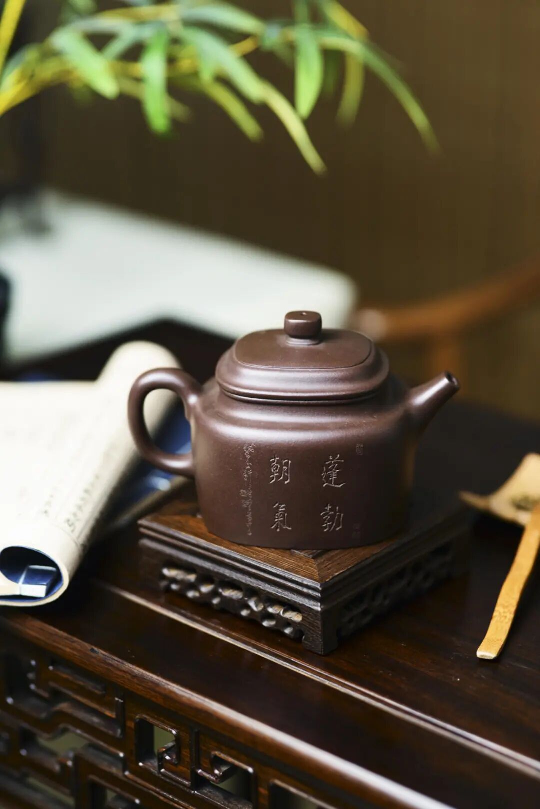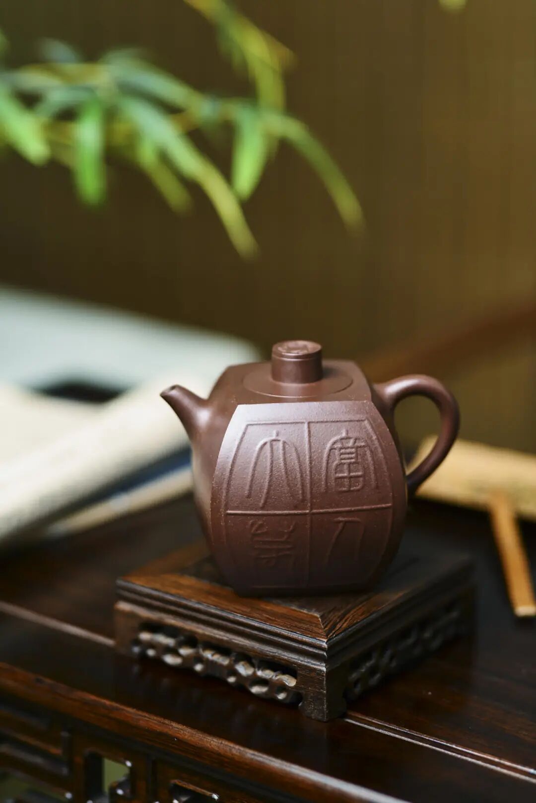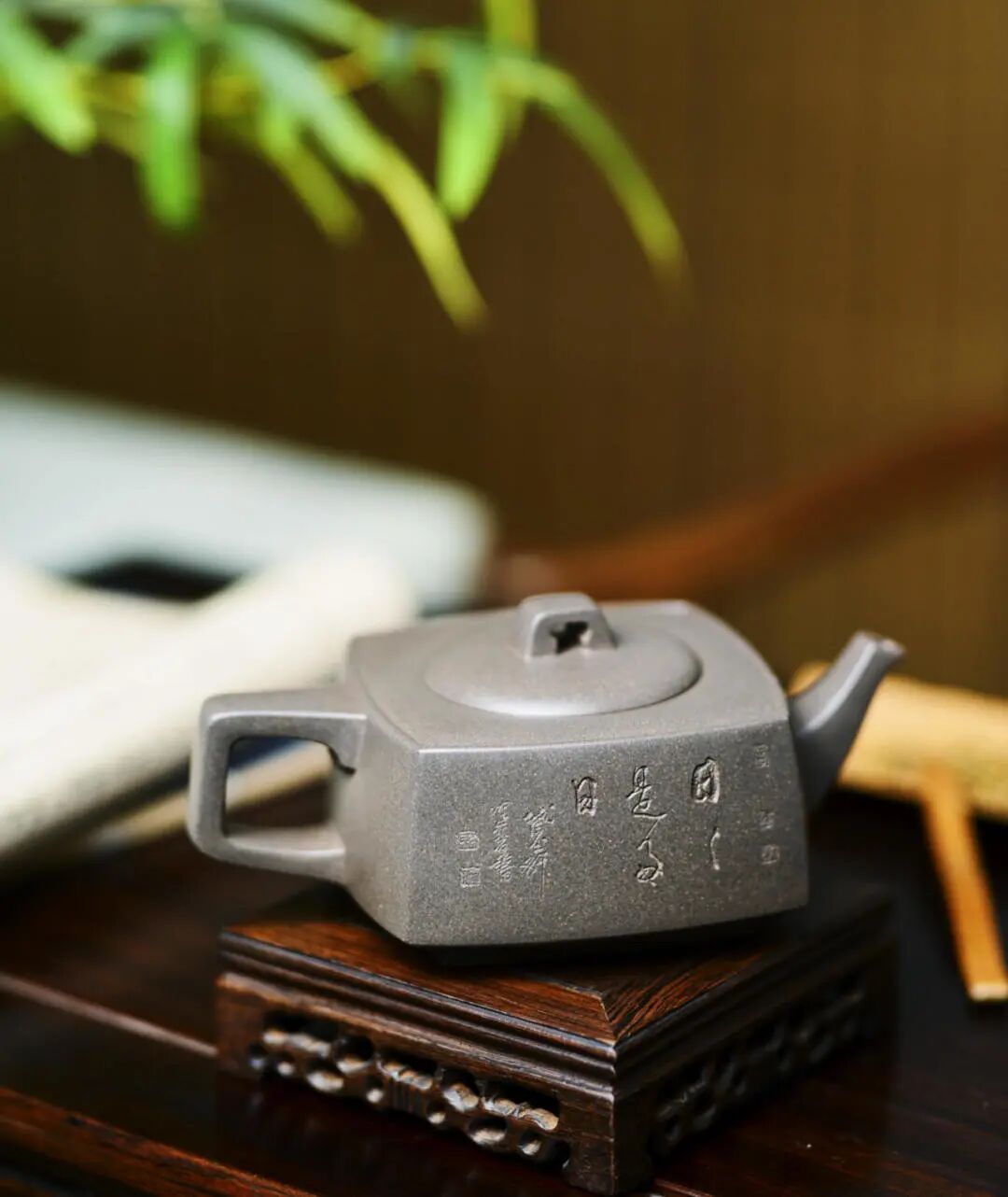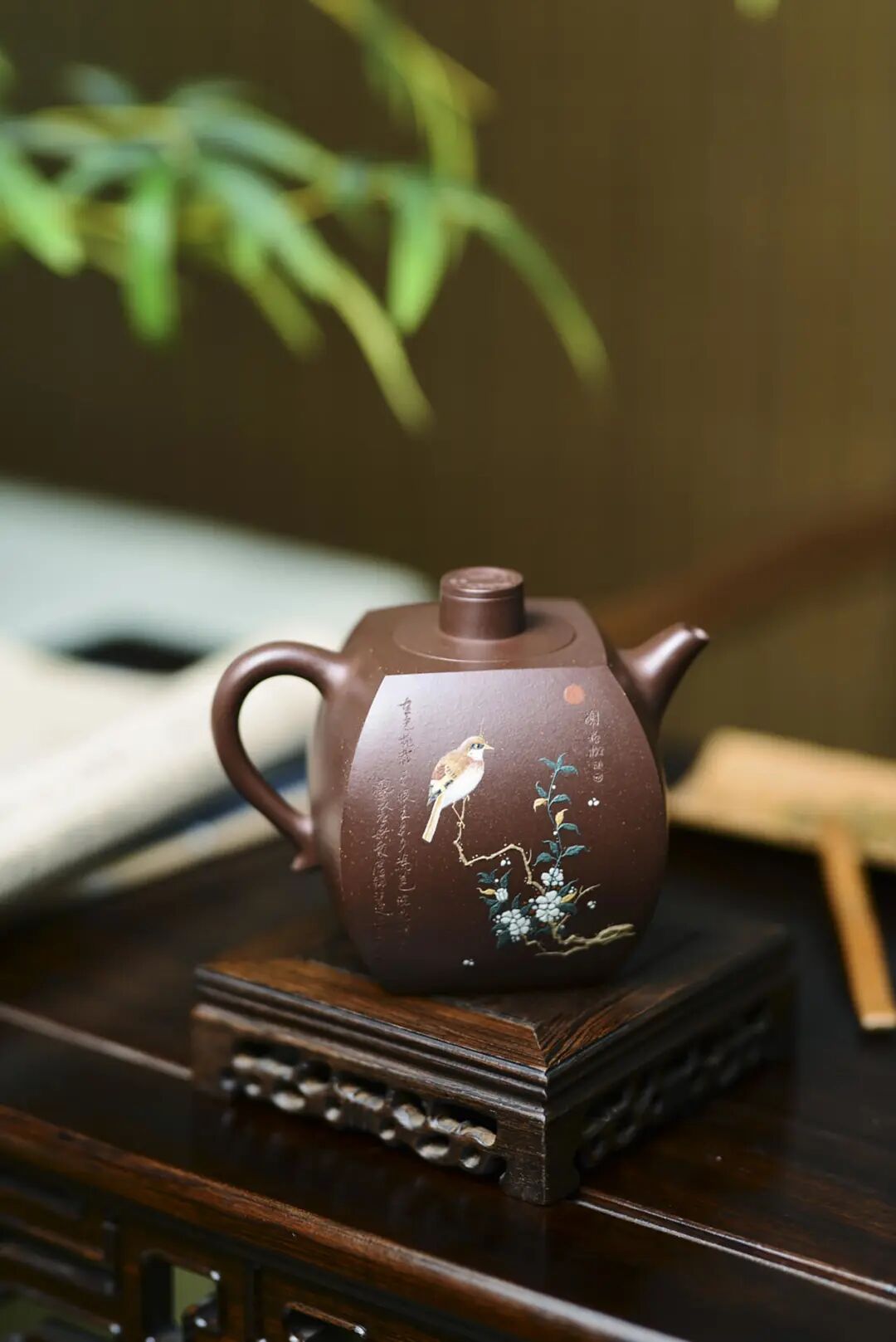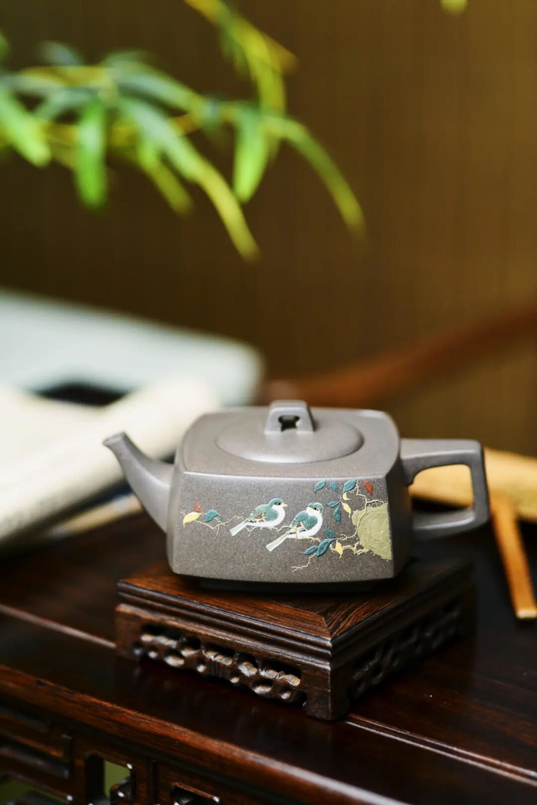 “金砂四方”紫砂壶,此件紫砂作品为方器,做壶的都知道,方壶难做,宁愿做圆壶,也不想做方器。王芳老师反复调整壶型的比例,再将先生的“实木良禽”完美的呈现在壶身上,远观此器,似画中的鸟儿跃出纸面,栖于壶上,壶背后有陈老的“日日是好日”,则力透纸背,以双刀古法入壶,比例遒劲,似如切石断玉之功,可谓如切如磋,如琢如磨。