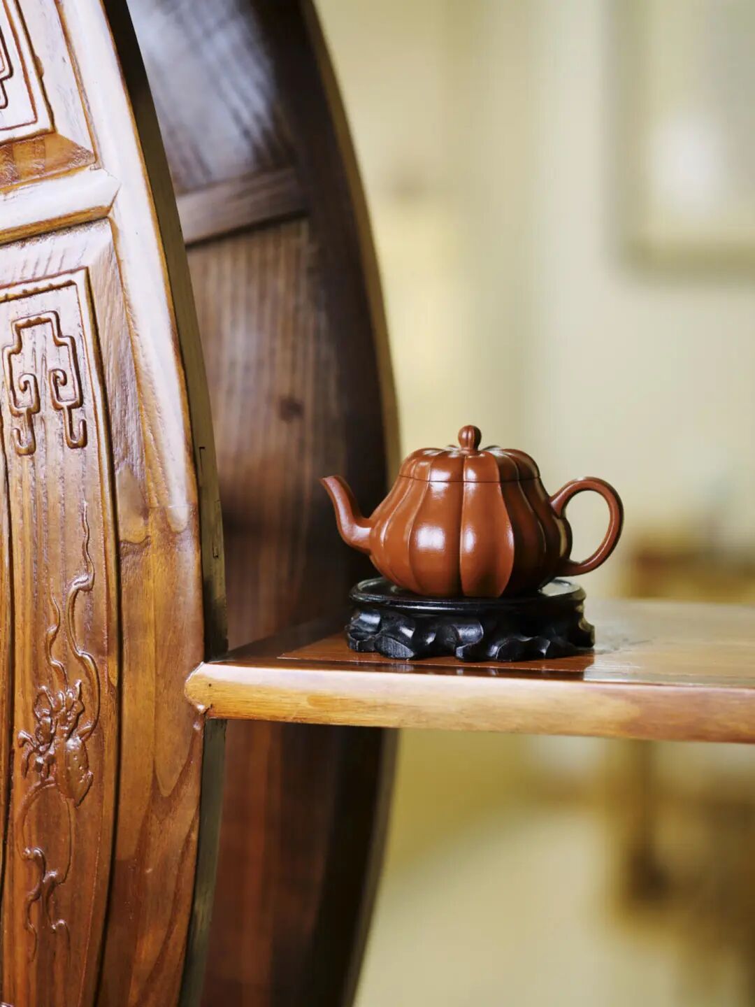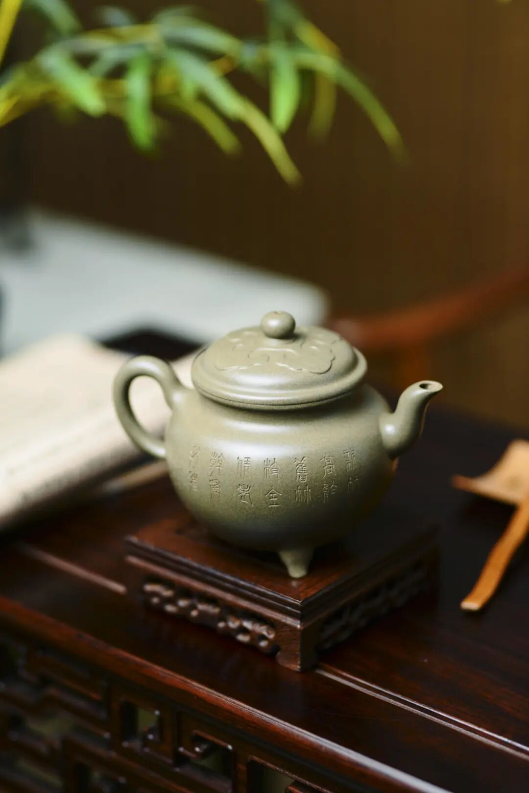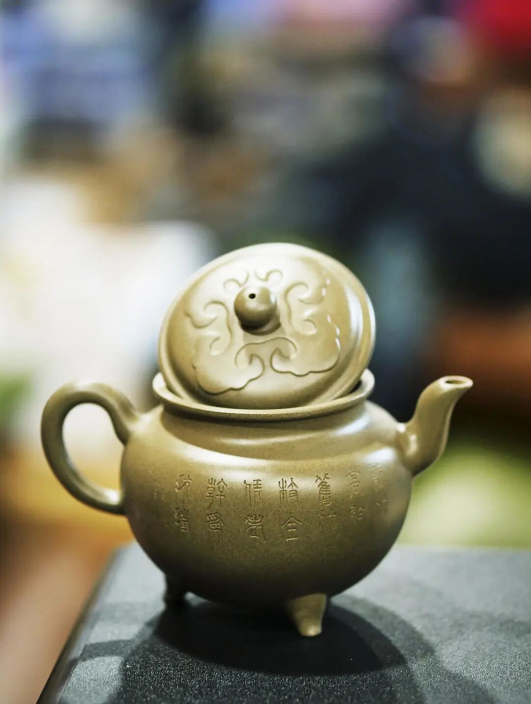 大彬如意是一款经典的器型,此款壶既有“事事如意”之意,又有以三足撑体的“鼎立”寓意。大彬如意无论是气韵神还是工法都堪称是明代紫砂壶中的极品,到今天依然是后人不可逾越的楷模。盖呈凸圆形,为压盖。盖面贴有四瓣如意纹饰,对称分布,厚度约为1毫米,工艺精良,扁圆形钮,盖中有一出气孔通钮顶,盖内孔大,顶孔小,孔圆规整,做工讲究。三弯嘴内敛,气息庄端且聚气,大彬如意器型古朴雅致,大气不洪,完全展现了时大彬的制壶风格。此壶可以说是紫砂壶中不容错过的一个器型,壶型取“聚宝盆”状。三足短小有力,作为紫砂壶中经典器型,这样的“简单”造型反倒更难以把握。