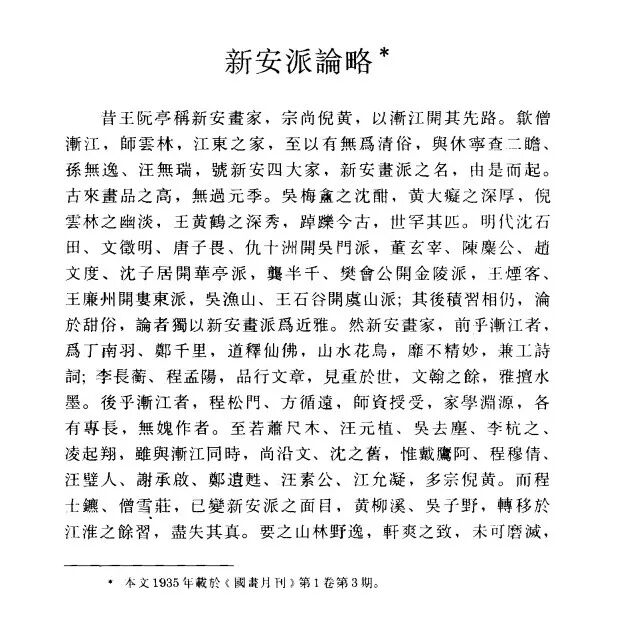 张庚是最早提出“新安派”名称的人,其在《浦山论画》中写道:新安自渐师以云林法见长,人多趋之,不失之结。即失之疏,是亦一派也。此后,“新安画派”的概念不断被沿用,遂成定论。