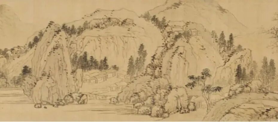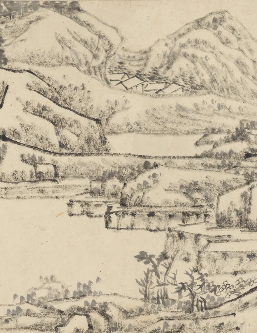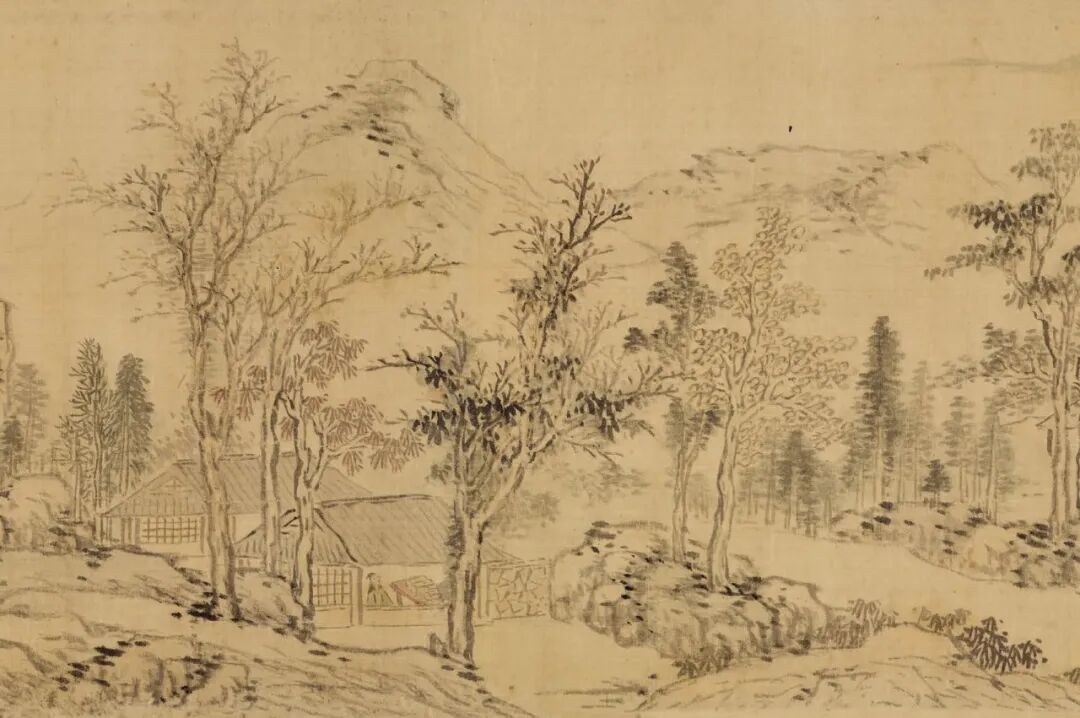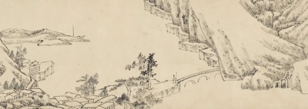 檀 园 萝 壑 “檀园萝壑”则为李流芳的书斋画室。明万历乙巳年(1605),流芳着手在南翔近郊精心筹建一座私家园林,名檀园,累年方成。园中“房廊水石,映带嘉木”,其景观格局皆为李流芳亲自设计。“萝壑”为李流芳的书画室,“翏翏亭”则为其独坐思吟的场所。细观本卷中心画段所绘的林壑环绕的敞牖书斋,极似画家对居于“萝壑”中的自我形貌及心境的生动摹写:迭案书册旁,一儒服高士缓身起立,在盈窗秋气中望着萧萧而下的干枯落叶,倏而触景伤情,感喟自己廿年来仕途不得志的愤郁惆怅,以及明廷朝纲不举的晚景秋风。书斋外,一条通幽曲径联结着不远处的溪亭疏树,这是倪瓒山水中幽澹旷远的空亭意向,也是挣脱功名枷锁后的李流芳作翳然林水间濠濮之想的“翏翏亭”。