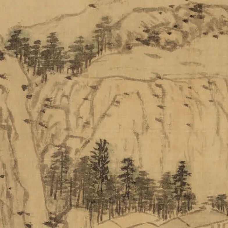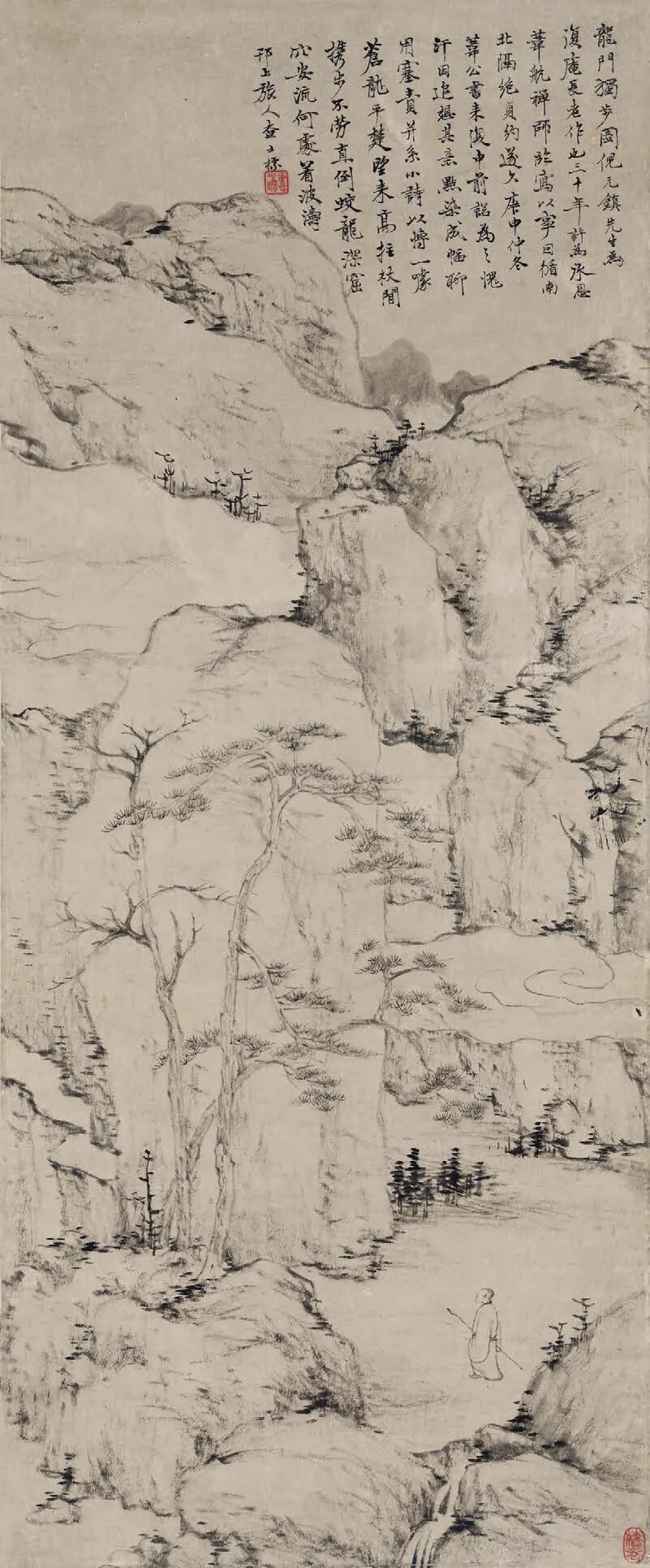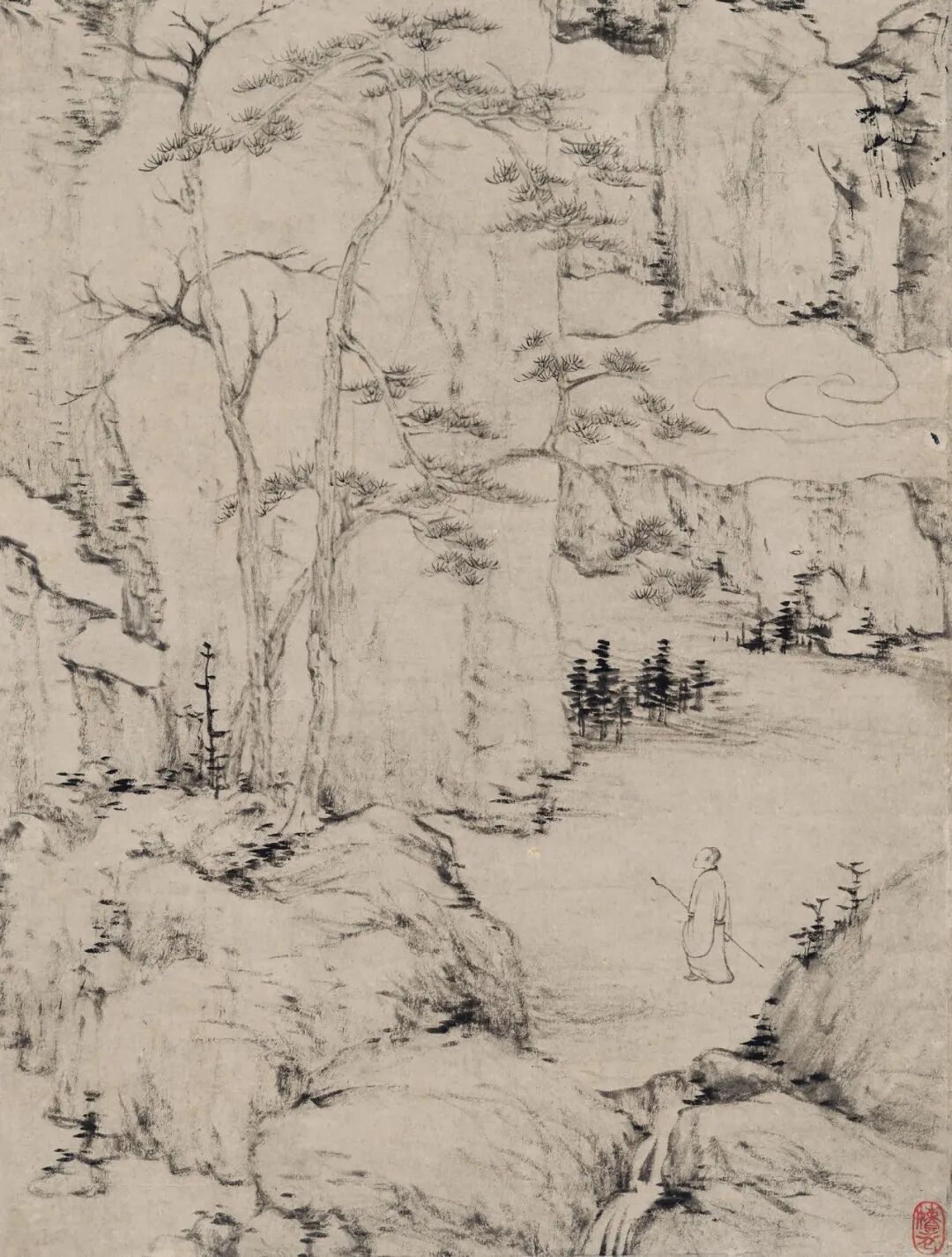 倪氏原作是为和张雨诗意而为复庵和尚所作,“山廓颇巨,用笔极细,墨法亦淡。一松轩仰,一栎傍之。而当路隅,一僧昂然行其下。盖写张伯雨诗中所谓断江恩公也……”云林山水多作萧疏平远之景,鲜少着人,唯恐沾染尘气,而《龙门独步图》作一策杖闲行的衲子,是因诗而绘,作“万壑千岩独杖藜”之境赠与方外友人,其画题旨趣正与本幅临作有着异曲同工之妙。