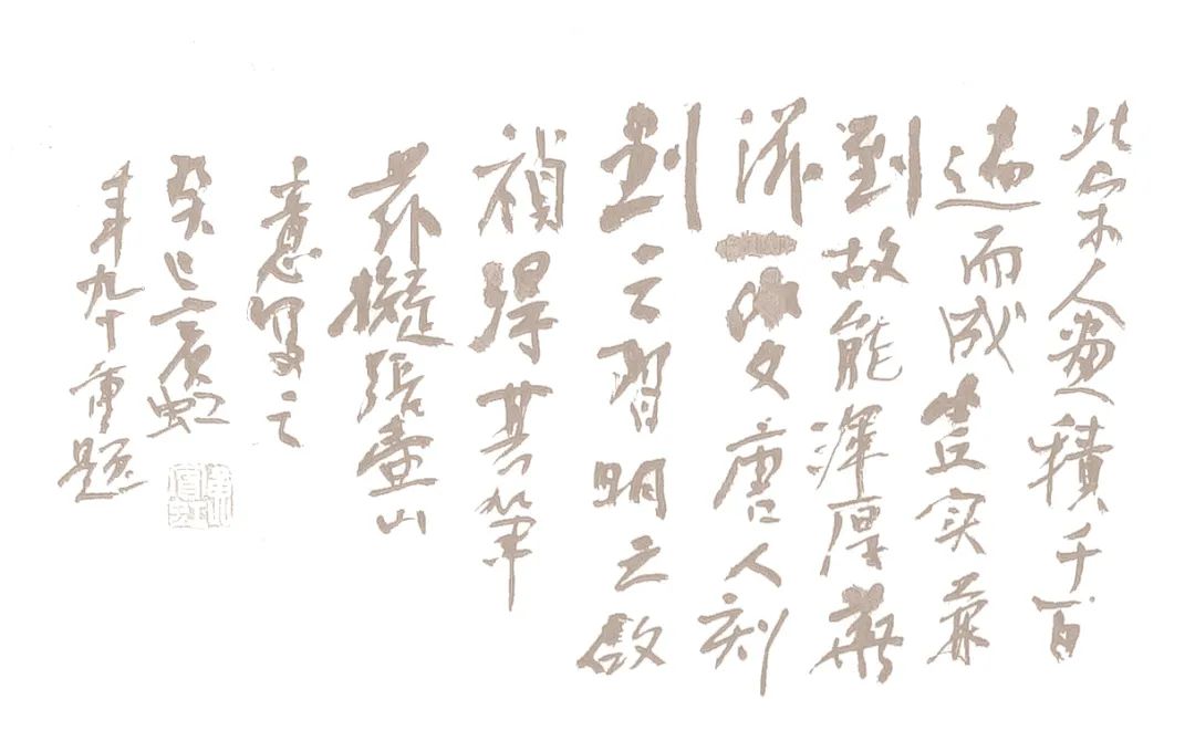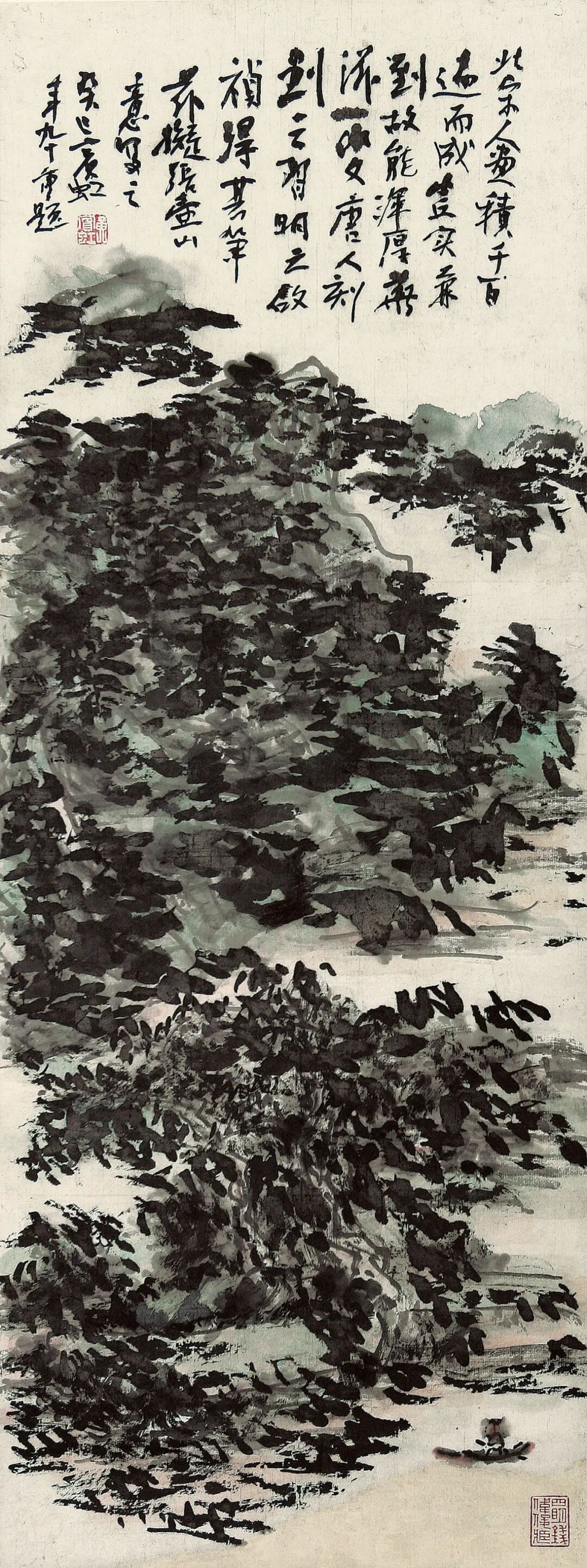 癸巳(1953年),宾虹年九十重题其《拟张恂山水》。全图以墨点铺就,密不透风。极抽象,墨色中透出铜器之红鏽绿斑,近乎天籁。与其自藏张恂山水轴对比视之,即知宾翁将壶山的笔墨语言加以抽绎、纯化和极致化,最终形成自己独到的黄家山水风格。