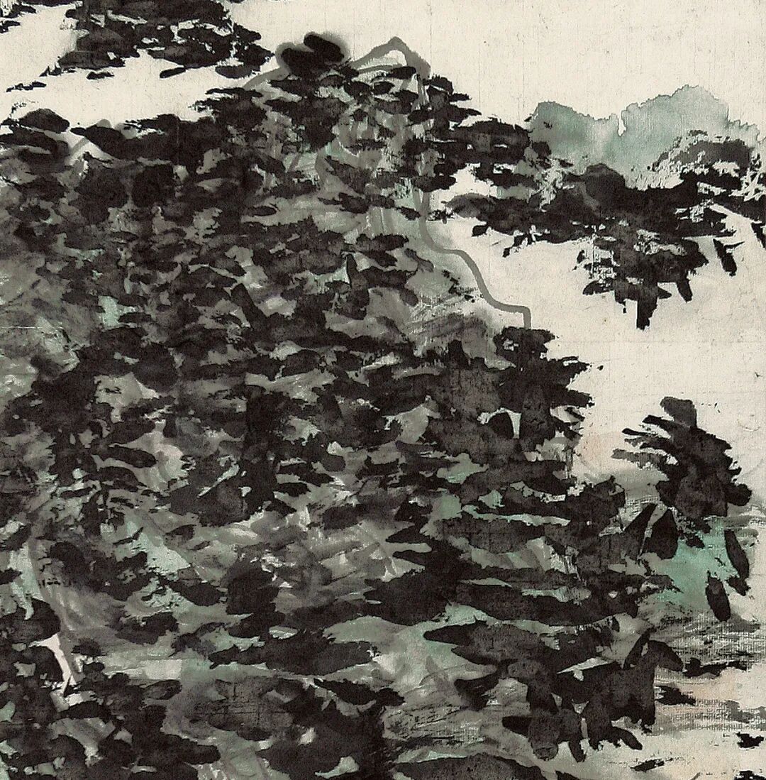展观本幅《峨嵋伏虎寺》,清晰可见四层笔墨:最底部朱笔打稿;中间淡墨勾勒;上层浓墨提携,偶尔枯笔穿插;最后泼墨破墨,水气淋漓。其中底层的朱笔、淡墨,都与题款中的笔法墨色完全一致,破墨则当用大笔。画面中简练的线条勾勒,在经过层层积染的苔点与墨团的融合映衬下,用积墨、破墨等法,任意积染写出“黑山黑树愈见黑墨团团,而又愈见浑厚华滋之象”,可见其笔墨之真谛已臻出神入化之境。