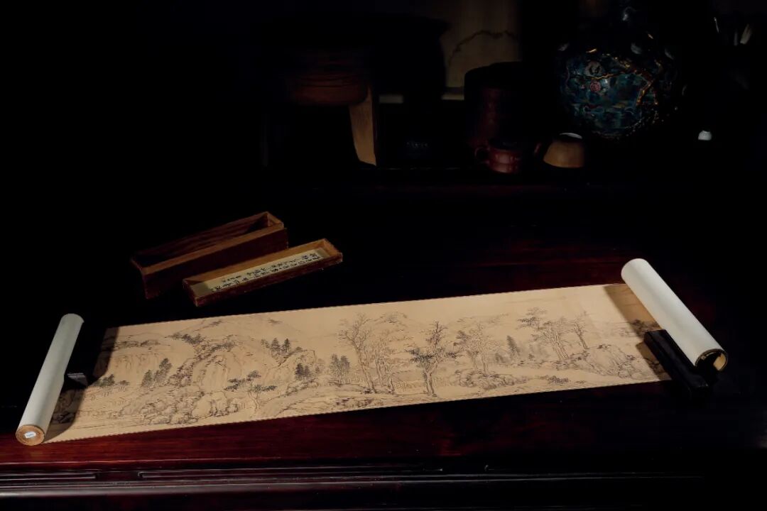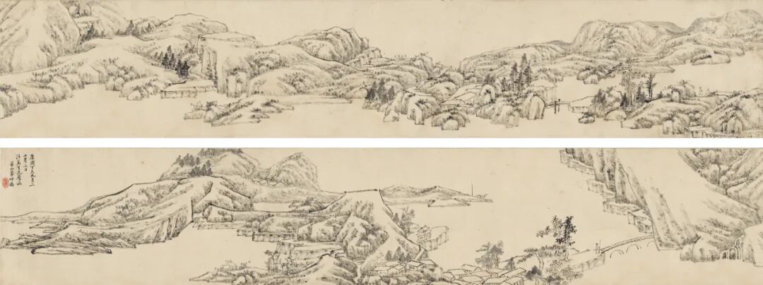 传 承 有 绪 本卷于明末清初为吴郡大收藏家朱卧庵所获,至清末递传至海上藏家顾少梅,后又流域东瀛,为日本著名南画家田能村直入、村田香谷等宝藏赏爱,并视之为“流芳最得意之作”。拖尾并附明治时期画家柳溪拟李翁笔意戏作的秋林小景图,笔法松秀,清润可爱,颇具文人情致,不啻为日本南画系统对中国文人画风格受容的有力印证。
