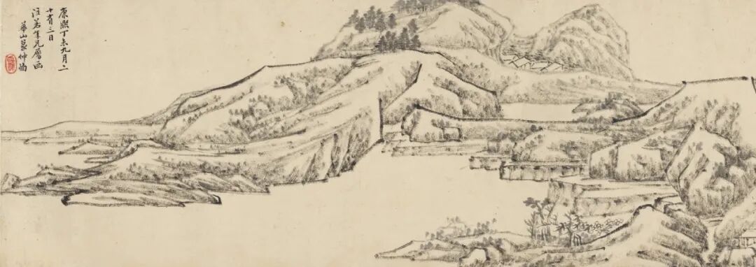 程 穆 倩 张恂于崇祯十六年(1643)中进士,在当时曾以诗文名满天下,被誉为“天才隽迈”。早年在江都与吴越文人名士广泛交游,其中包括新安殿军人物程邃。二人朝夕相处,故其早期画风与程穆倩绝似,如清鉴藏家周工亮所言“不辩孰为程张”。1655年后,张恂受召入清廷,其画才得到顺治帝赏识,赐为给事中。本卷作于康熙丁未(1667),是张恂入京之后形成自家风貌,代表其性情的的典型作品。山石的主体虽仍以程邃典型的干笔渴墨点子皴画就,但在线条勾勒上,本卷处理的更加简率苍雄,坡脚转折处干脆洒落,充分体现了张恂中晚年时期与新安画风之间亦亲亦疏的张力。程邃曾云“稚公于秀峭见厚重,此能以山水为性情,以性情为笔墨者”,用于此卷恰如其分。