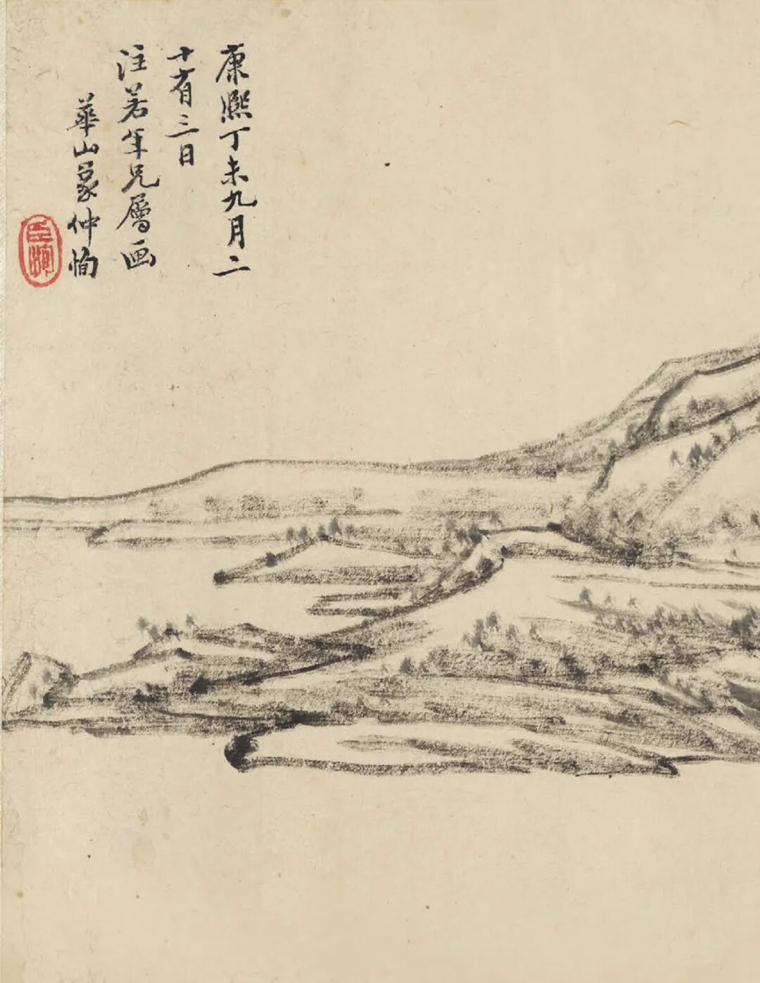 旅 人 本幅作于康熙庚申年(1680),款署“邗上旅人”,表明此为画家寓居扬州时所作。图绘云盘雾绕的旷野幽壑之景,笔法鬆秀,墨色简淡而意境旷远。