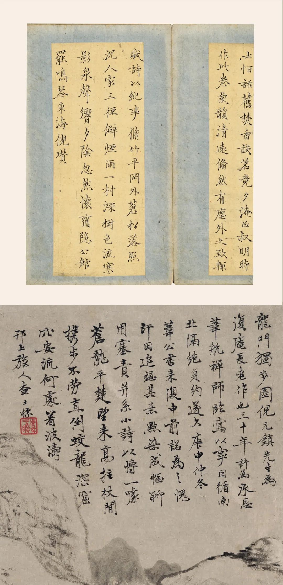 上图为2021西泠印社春季拍卖会1496号拍品査士标早年罕见信札及罕见小楷册。册中此二页诗为査士标早年罕见的临倪瓒书法,是查氏书法来源的铁证,也与本幅画作互相印证。